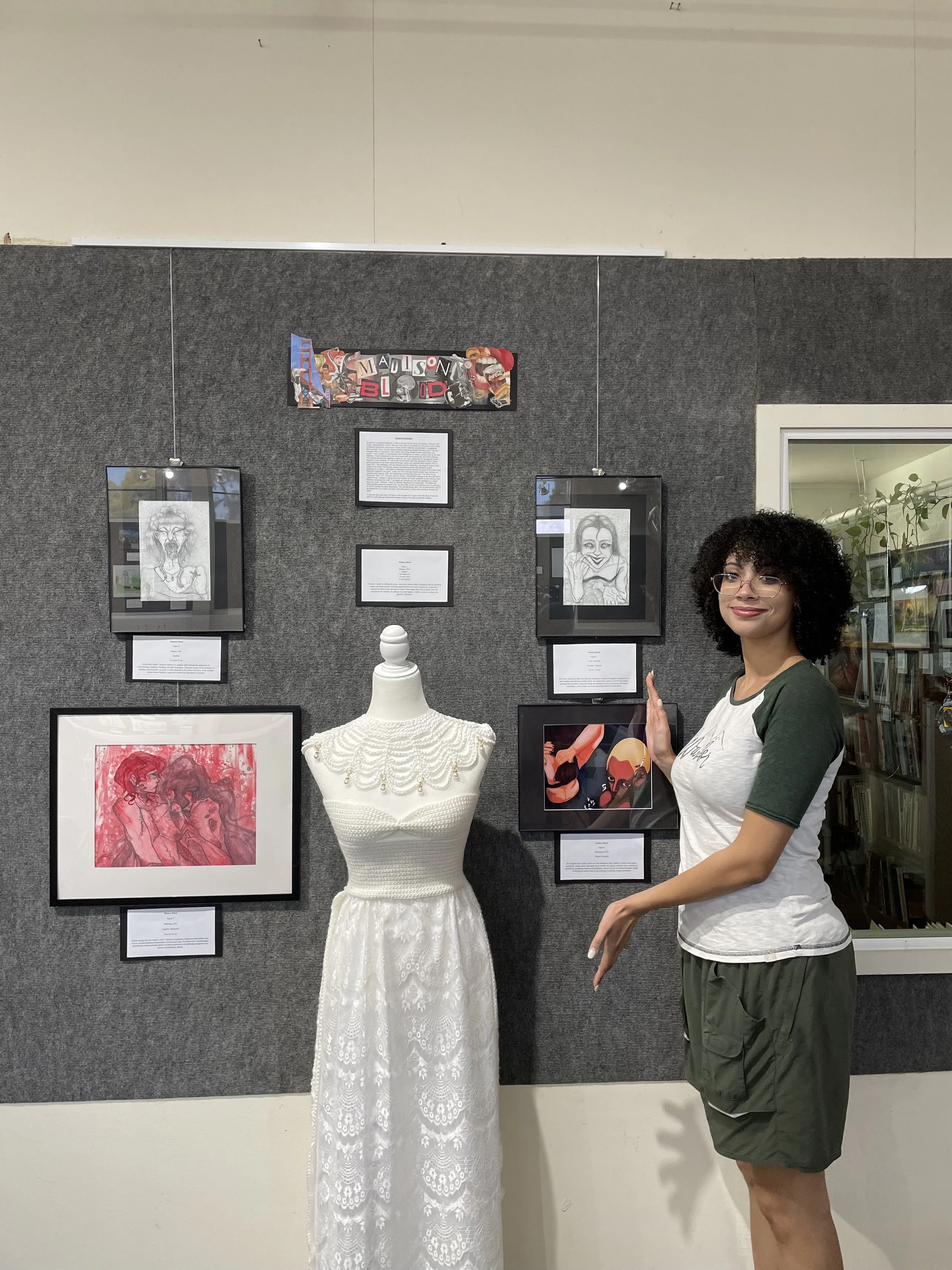 As part of a curatorial Rationale, I will be delving into the theme of emotion, with my work being a representation of how I feel and what others feel around me. My pieces carry a deep emotional significance and employ various artistic elements and principles to emphasize their message. Every artwork chosen features something innately feminine since I feel the strongest form of connection with women, from being raised by them and being a girl myself. I had a couple of inspirational artists throughout my artistic journey such as the artist Mijanou, I found inspiration in the brown maxi skirt showcased in her 2023 fall collection. The intricate pattern and repetition caught my eye, and I endeavored to incorporate similar elements in my creations. As well as the revered artist Shin-ichi Sakamoto which I found great inspiration in the series Innocent Rouge, which was serialized from January 2013 to April 2015. The stunningly rich and detailed artwork, depicting a dramatized version of the events of the French Revolution, earned widespread acclaim and numerous award nominations in Japan. I was eager to challenge myself to recreate the same level of detail that Sakamoto imbued in his work. Lastly one of my all-time favorite artists Egon Schiele, an Austrian artist born in 1890, my inspirational artwork from him was "Two Girls, Lying Entwined," from 1915. The pose and the distinct, well-defined features of the face and body captivated me. I aimed to capture the same essence of female sensuality in my creations that Schiele conveyed in his work. "I arranged my artwork in a way that highlights my largest piece my work, “Delicate” which is currently displayed on a mannequin. The black and white graphite pieces are placed at the top since they are the most detailed and eye-catching, as well as sharing the same dimensions. The colorful pieces that I am not particularly fond of are placed next to or below the black and white pieces to draw more attention towards the dress."