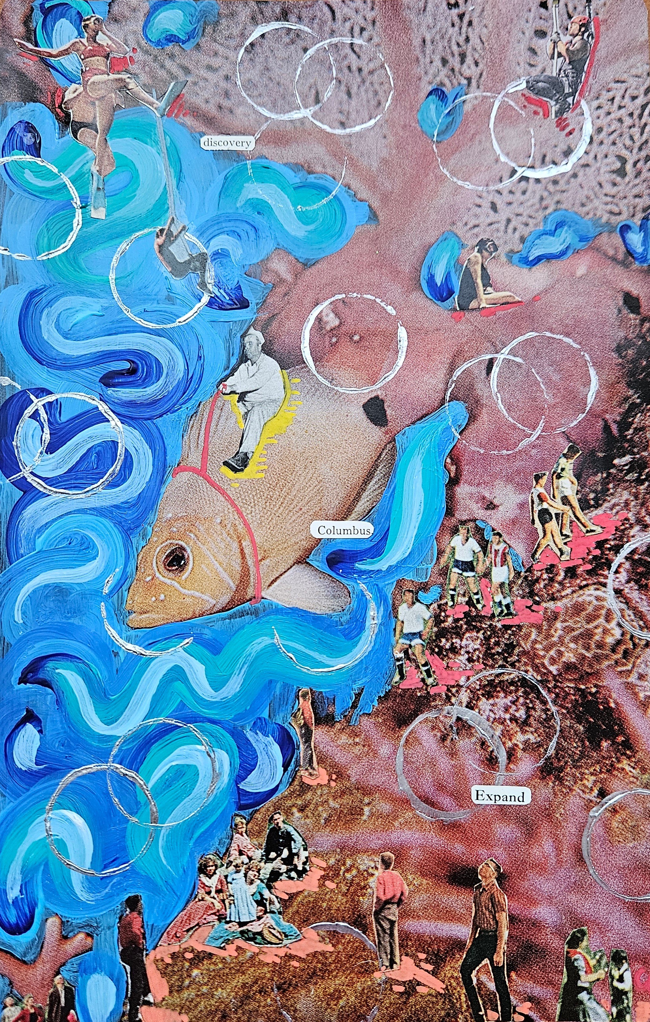 The theme of the relationship between humanity and nature is multidimensional and can be approached from a variety of perspectives. Within my body of work I attempted to examine a few specific primary angles to this topic. Within pieces such as Waste and The World is our Oyster, I examined the negative aspects of this relationship, particularly focusing on the consequences of the pollution of bodies of water, an issue plaguing aquatic ecosystems globally, and an overall disregard for the health of the environment. I was inspired primarily by discourse and discussion surrounding the rapid deterioration of the planet due to human influence. Additionally, I examined humanity's place within the natural world in pieces such as Overlook and Thumbelina, intending to convey the interconnectedness between humanity and nature in a more positive light. Within my body of work, I have implemented a diverse variety of art making techniques and mediums, selecting the methodology most suited to conveying the intentions of the pieces. In many pieces displayed I utilized vibrant color schemes coupled with intricate texture in order to mimic the diverse colorful qualities of nature and various elements of the natural world. In order to achieve this, I created my pieces with various mediums, including, but not limited to, acrylic paint, oil pastels, magazine clippings, and even sculpture. The utilization of a vast scope of materials and techniques allowed for the depiction of a plethora of textures and subject matter as well as encompassing the diversity of the natural world.