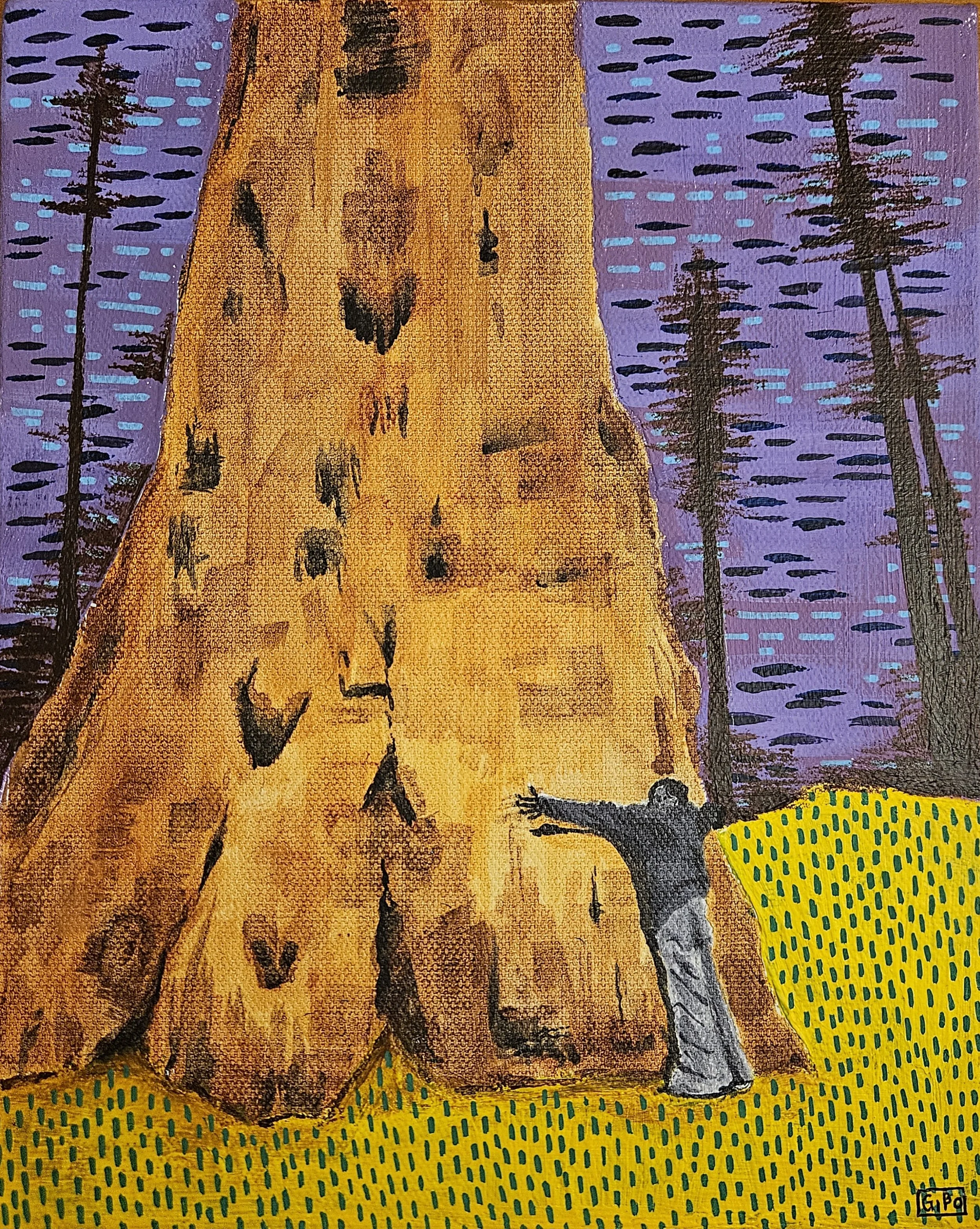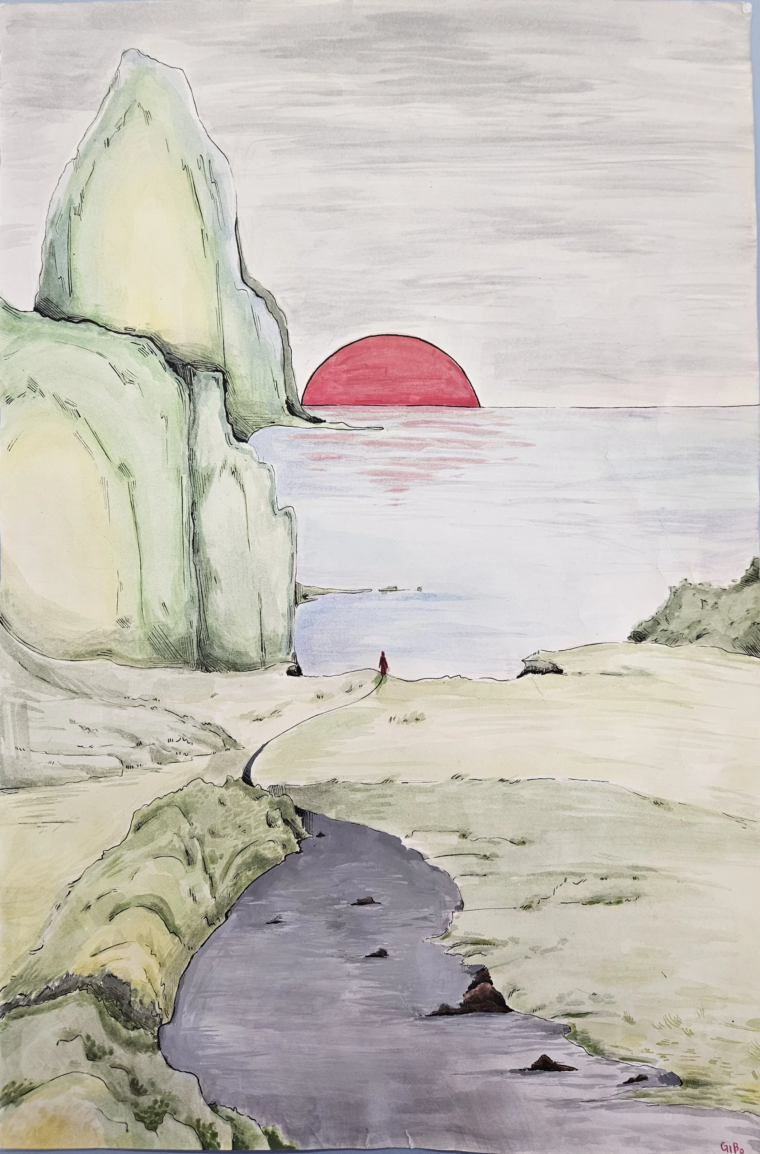 This piece intends to explore the theme of the relationship between humanity and nature, specifically the minute existence of humanity amidst the vastness of the natural world. Humanity often views itself as a dominating force, but this piece strives to contrast that perspective and serve as a reminder that we are but a minuscule component of a bigger picture. The painting achieves this by depicting an expansive landscape with primarily cool colors and a small red figure at the focal point.