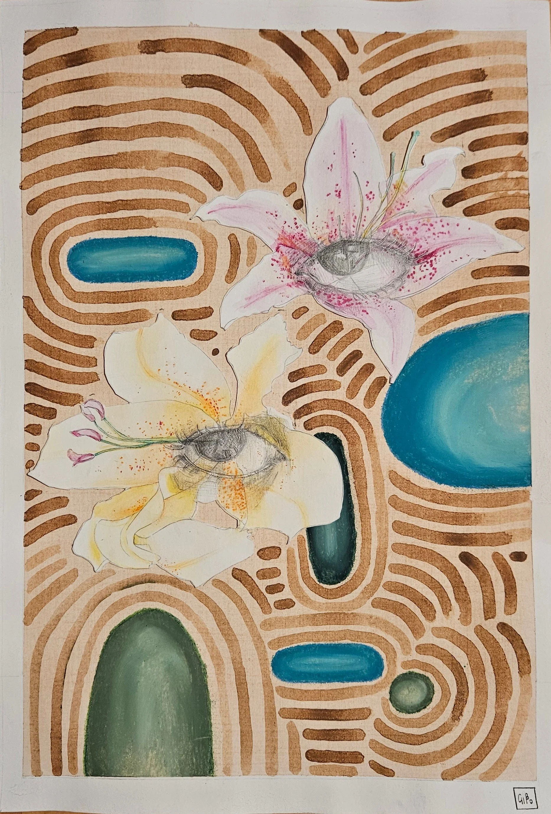 This piece intends to convey the relationship between humanity and nature, particularly the intrinsic intertwining of the two together and the idea that we as humans are all children of nature. The artwork implements organic shapes and textures similar to those of Picasso’s works in the background to emphasize this immersion in nature and create an abstract portrait. Vibrant watercolor seeps into the grey eyes embedded in two lilies, conveying how nature brings color into our lives.