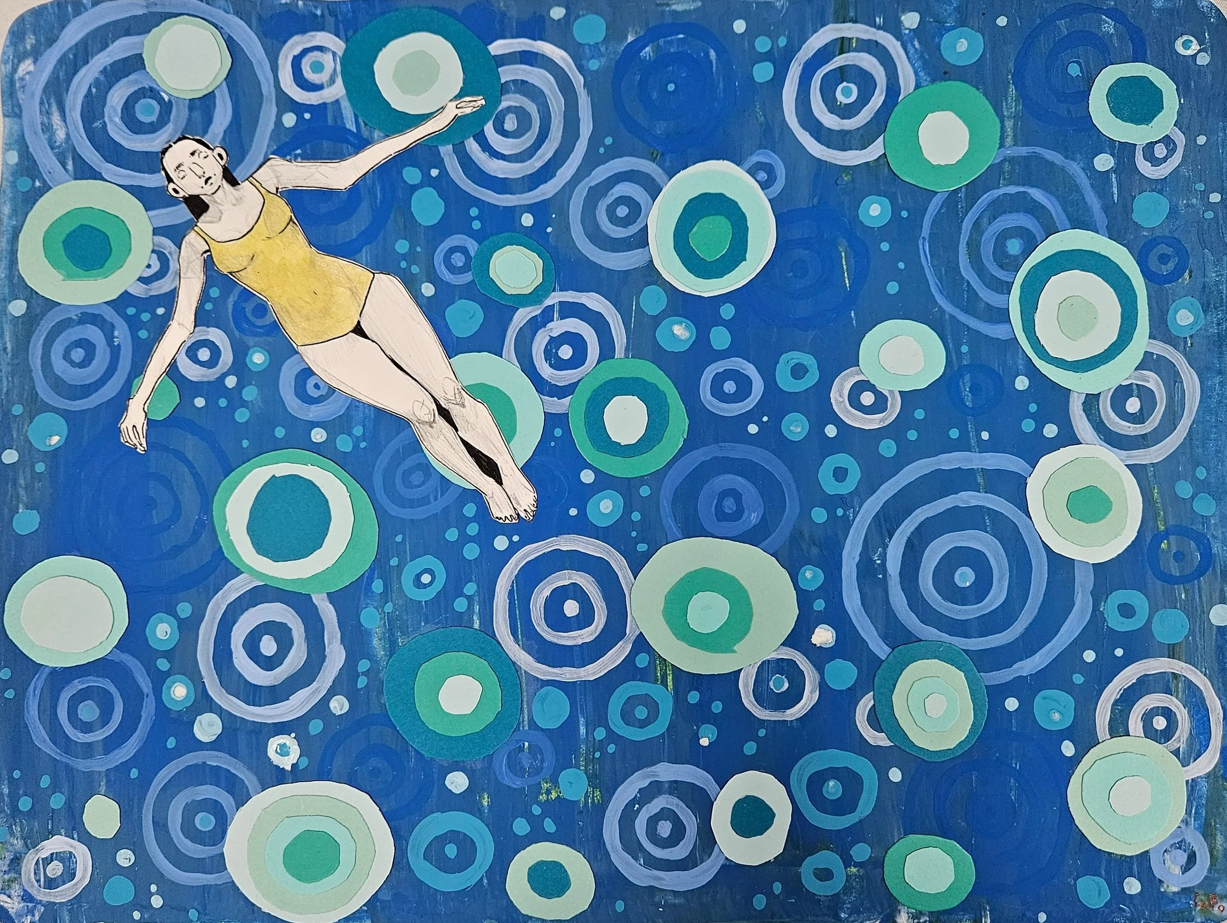 This piece intends to convey the relationship between humanity and nature, specifically the sensation of peace and relaxation associated with being immersed in a body of water. The artwork implements dense texture and vibrant colors, drawing inspiration from the works of Gustav Klimt which similarly incorporate busy textures and bright colors. The soft shapes and cool color scheme emphasizes the concept of tranquility as these are elements associated with this feeling.