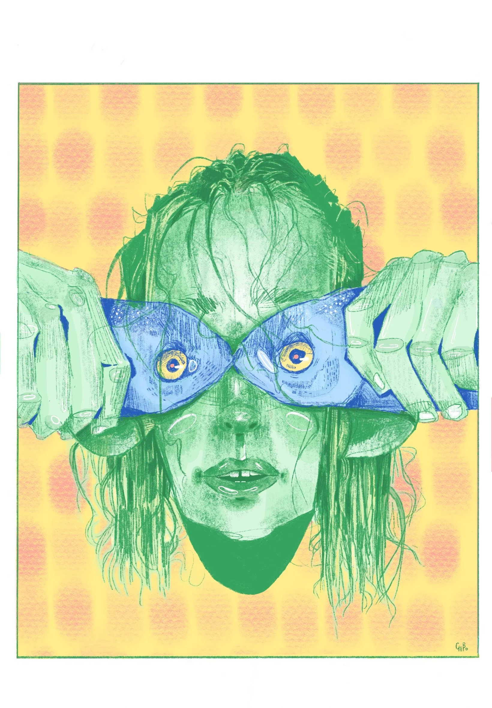 This piece is inspired by the works of Frida Kahlo and photographer Kevin Meredith. Both pieces inspired the subject matter of the piece, but the latter inspired the message of the piece and the former inspired the composition and colors of the work. The artwork is a digital piece with a primarily monochromatic color scheme for each individual element within the work. The piece intends to convey the concept of viewing the world through the organisms with which we coexist.