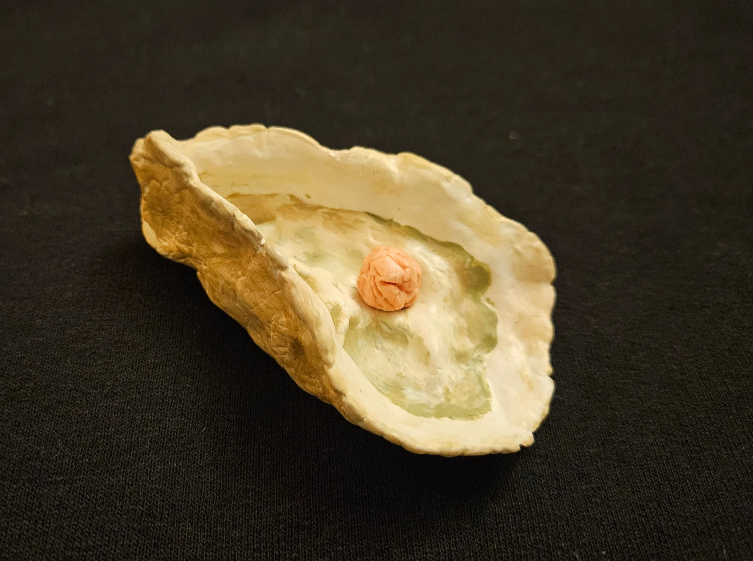 The saying “the world is your oyster” traditionally refers to the abundance of opportunities presented to an individual. This piece intends to place a literal spin on this statement, depicting Earth as humanity’s oyster and conveying the ways in which we have mistreated the environment. The piece of gum, alluding to a pearl, is symbolic of this treatment, as a piece of garbage carelessly discarded within the shell. Ultimately, the world is our oyster, and we are ruining it.