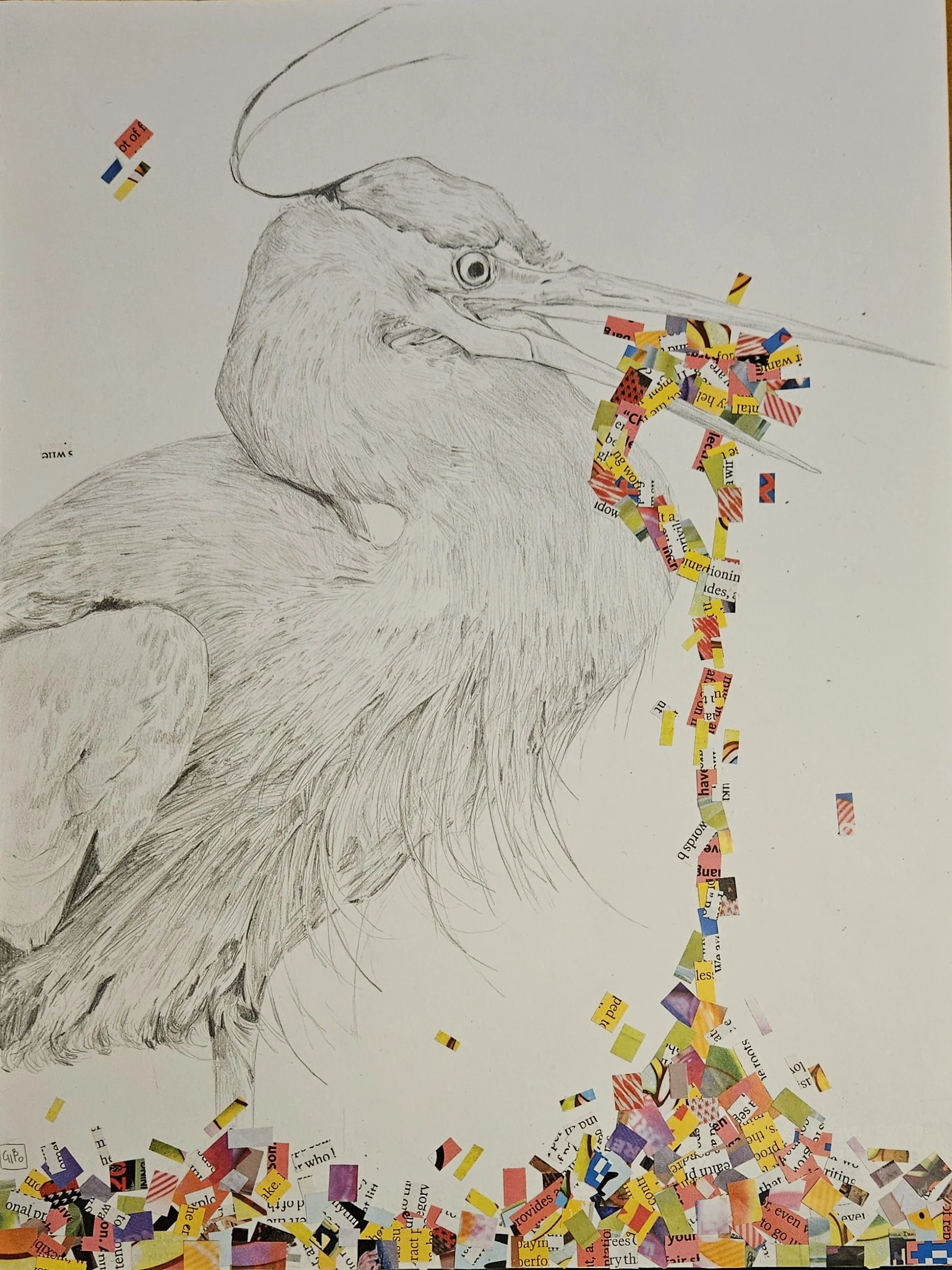 23.0 cm x 30.5 cmThis piece intends to convey the relationship between nature and humanity, specifically commenting on plastic pollution in aquatic ecosystems which is detrimental to the health of organisms residing in these habitats. Oftentimes, avian organisms in these biomes are discovered with plastic waste filling their guts. This piece conveys this issue in a critical lens through using vibrant consumerist magazine clippings to symbolize this waste and contrast the simplistic Great Blue Heron.