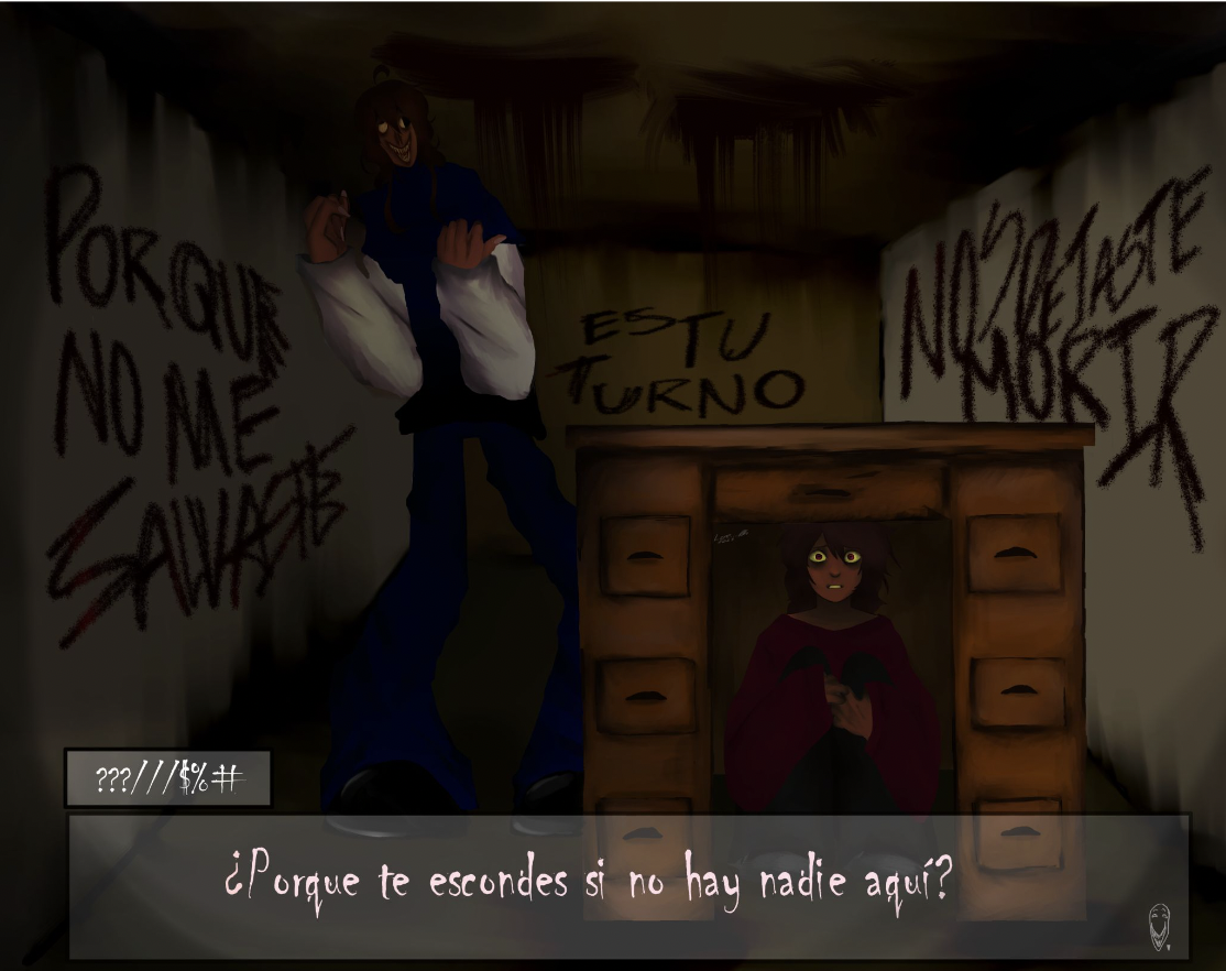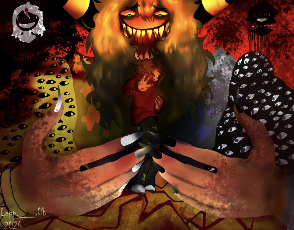 This artwork’s theme is based on the theme storytelling , in this piece particularly the main character here is the one underneath the desk (Tadeo). He is terrified and scared due to the fact that the creature that is behind the desk was his brother , unfortunately he’s been morphed into this monster and can no longer recognize or think about anything. What will Tadeo do?