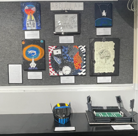 We always ask ourselves what the future looks like, some make time capsules and some leave knowledge behind. The future is inescapable with many hidden gems of knowledge and technology with infinite possibilities to our human race. Art can be performed in endless ways expressing many different themes and ideas. Some of our earliest human memorization as a species came from art from architecture to writing art pieces. Many paintings create and define who surtain people are and how their culture has come to be. I wanted to create a different vision close to many others visions of the future to introduce new ideas and perspectives to my audience. Background information was a heavy usage technique that brought my ideas to their full potential. Creating multiple projects using many different medias and background studies help me figure out the ultimate theme for my works, The theme of future. My method and technique of exhibiting my artwork was to contribute a meaning of a different perspective a little different than the majority of other artists with the futuristic theme style as I never saw exactly what I thought when I heard of the future. I used many different submitting elements from modern day technology and themes to include as my own as the future is happening within every second of our lives day by day, week by week, month by month, and year by year. Using elements from an everyday perspective that can connect with the audience directly without any physical explanation is the key to understanding someone especially through the art. There were many options of themes I could have chosen but me, always being fascinated by the universe around us, chose the futuristic theme which helped me showcase my ideas through these artworks that was unique to me and different from everyone else's. The most fun part creating all of these artworks was to think of an idea knowing that it is very unique by itself and that it cannot be replicated nor has it been before. strategies I used to help me connect with the viewer is to have relatable messages through the art such as objects or actions we all can relate to to help the reader feel more connected with not only the artwork but with the artist. I use symbolism and many of my artworks To help show my ideas and share what my process and perspective was of each individual artwork. I have specifically arranged my artworks in such a presentable way that supports the relationship and helps the connection by simply being relatable. I intend my audience to feel That there are much greater possibilities in the future and ideas that can be brought to life in which each person has a different perspective of the future that can only be expressed when shared. I want my audience to also think and experience how many different people in Generations have pictured the future with each individual having slightly different perspective than another which is fascinating itself as all these people have their own way of looking at things. Sometimes looking at an art piece and admiring it isn't as important as analyzing and understanding the piece of art. Ultimately I want my audience or for anyone to see and experience my vision of certain things that may or may not be possible in the future. Artwork such as futuristic objects like a helmet or sport equipment or places all are eventually going to be redesigned with the help of creativity as being creative is one of the most important parts of making art unique not only to you but to your viewers and audience. I chose to layout my art pieces like how I did because it felt right to make them symmetrical to each other in a way where everything has its own space to observe instead of just art works next to each other. I did this because each artwork is different and has a different meaning and story behind it instead of making multiple artworks that connect which isn't the case for my style.