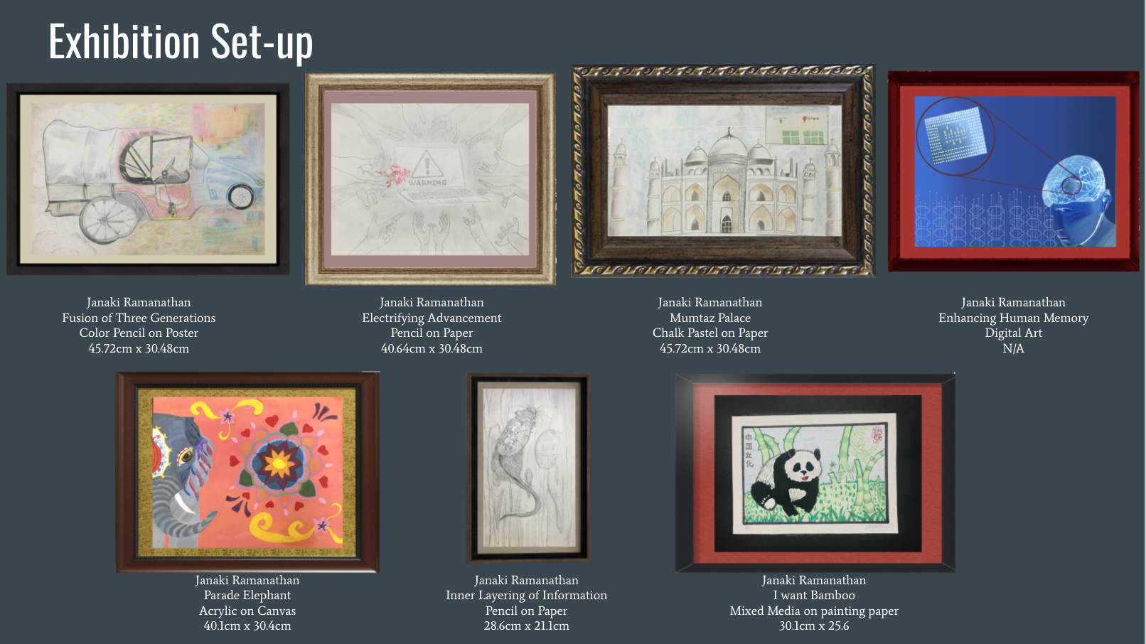 As displayed in the exhibition my artworks are created through a variety of techniques used and mediums, such as digital, acrylic, pencil on paper, color pencil, chalk pastel, mixed media, and print. Through my beneficial research and thorough understanding of the technique, art styles, symbolic elements, and cultural stories behind the pieces. With the help of my practice in each medium I was able to produce the product that I wanted to accomplish. The pieces Electrifying Advancement, Inner Layering of Information, Enhancing Human Memory, and Fusion of Three Generations all go along with the theme of Science and Technology. Each piece represents the modern era or a connection between the past world to the current state of the technological world.