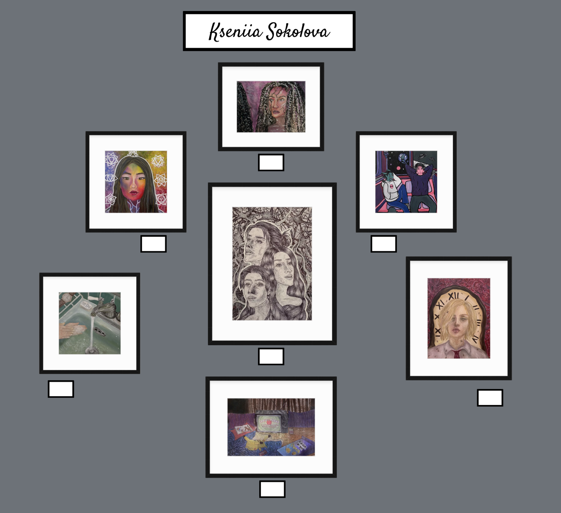 I wanted my body of work to look symmetrical and harmonical, so I decided to make a shape out of my artworks. Since “Collision of Minds” stands out the most due to its size and media, I felt the need to place it in the middle to not disturb the harmony and color scheme of my other pieces. The other six pieces surround “Collision of Minds”, creating a figure that resembles a rhombus. “Spiritual Awakening” and “Rebirth” are placed across each other in the opposite corners due to the fact that they both depict a close-up portrait of a person. “Reality Check” and “Observation” share a similar greenish-blue color, therefore they are also placed in the same way. “Lies that Seize into Darkness” and “Mandela Effect” are similar in shape, so they’ve been placed across each other vertically. In addition, “Spiritual Awakening” and “Observation” share identical proportions, thus adding a satisfying effect by being on the sides at the top. By arranging my artworks in this matter, the viewers’ eyes first go to the middle of the exhibition, then to “Lies that Seize into Darkness”, and then they have a freedom of choice in which direction they want to look afterwards. My pieces are all about completely different concepts, so the order in which they are viewed thematically is not significant. However, the color scheme changes gradually from one work to another, so this set-up works best to encourage the viewers to follow the art pieces in the recommended order.