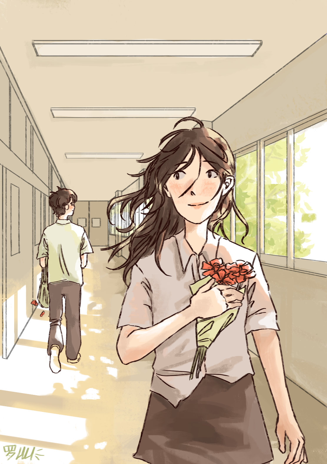 Self-Portrait as Memory portrays my parent’s recollections of them as high-school sweethearts in their year of separation before the 高考, China’s national college entrance exam. The yellowed background, awash with faded sunlight, evokes a sense of nostalgia. Through the red focal point of the flowers, the viewer is drawn back to present-day connotations of this piece— an indirect self-portrait portraying my familial lineage and history. -