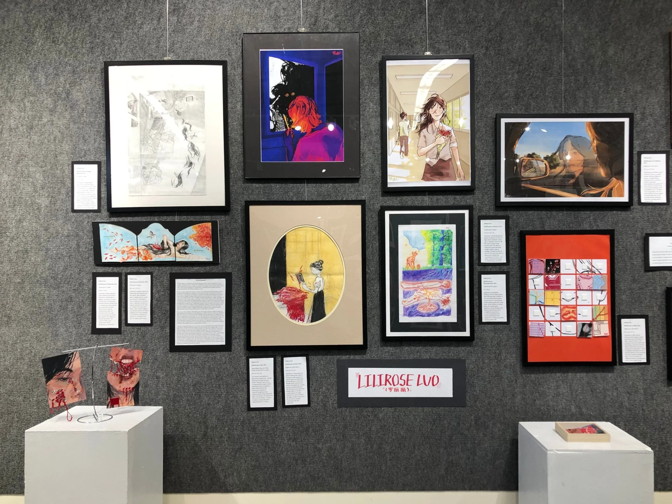 Because my theme originated as transience, my initial works are illustrated with varied mediums to portray constantly evolving perspectives. Inspired by two Asian-American queer poets like myself, Self-Portrait as Postcards draws on experiences with immigration & translation, especially communicating personal identity across borders & languages. Through combined blackout poetry and textile work, I examine language in terms of my sexuality; I’m able to discover English community & terminology, but struggle connecting to my queerness in my native Chinese tongue. In Self-Portrait as Teenage Bedroom, I synthesize Larry Clark’s gritty monochrome confessional style & a limited perspective to capture my experiences with the physical stagnancy of clinical depression, which I was diagnosed with in 2021. Through symbols such as a movie poster of Lady Bird, digital pixels, sheared-off hair, I establish dated references to this time period, which function two-fold as a reinforcement of the internalized violence of mental health. Self-Portrait as Devotion & Self-Portrait as Ma both work as explorations of my gendered femme identity & violence intertwined with it; the previous situates these themes in contexts of religion & myths, with line weight & nature symbolism inspired by Alphonse Mucha, while the latter grounds them in my own perspective of my mother.