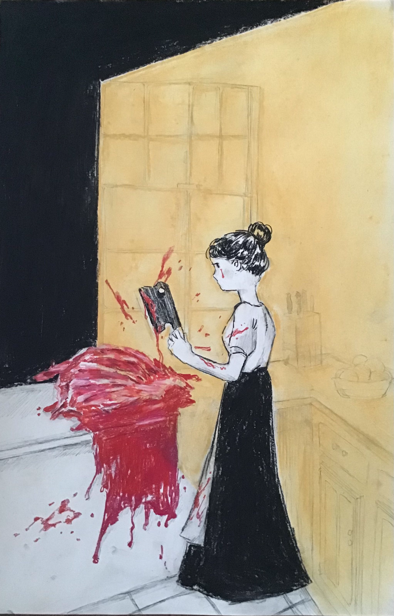 Self Portrait as Ma redefines of generational womanhood— and the fundamental strength and gore behind “feminine” tasks such as cooking and birth, despite society’s devaluing of them. It maintains a sharp contrast between the horror-esque elements of charcoal-smudged gore and shadows, and the softer chalk pastel light of the kitchen. My ma gazes out from over her shoulder, a moment of stillness amongst the violent dismemberment of a carcass. -