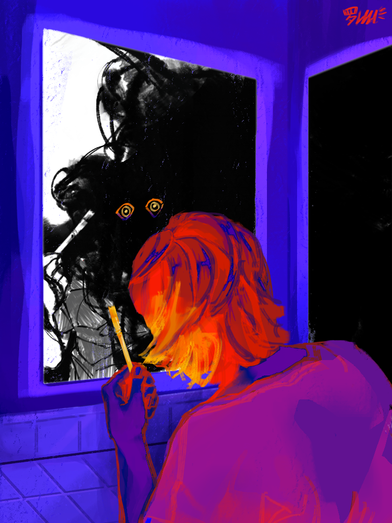 Self-Portrait as Artist presents an artist's breaking point. Mirrors showcase our presentations of self; this figure has defined their personal identity so exclusively through artistic merit that their mirror, symbolically also a canvas, presents a jumbled, inhumane self. The fluorescent, expressively rendered figure of the artist contrasts against the wispy, monochrome mirror. However, the bright, circular focal point of the eyes hint at a hopeful uncovering of the self underneath. -