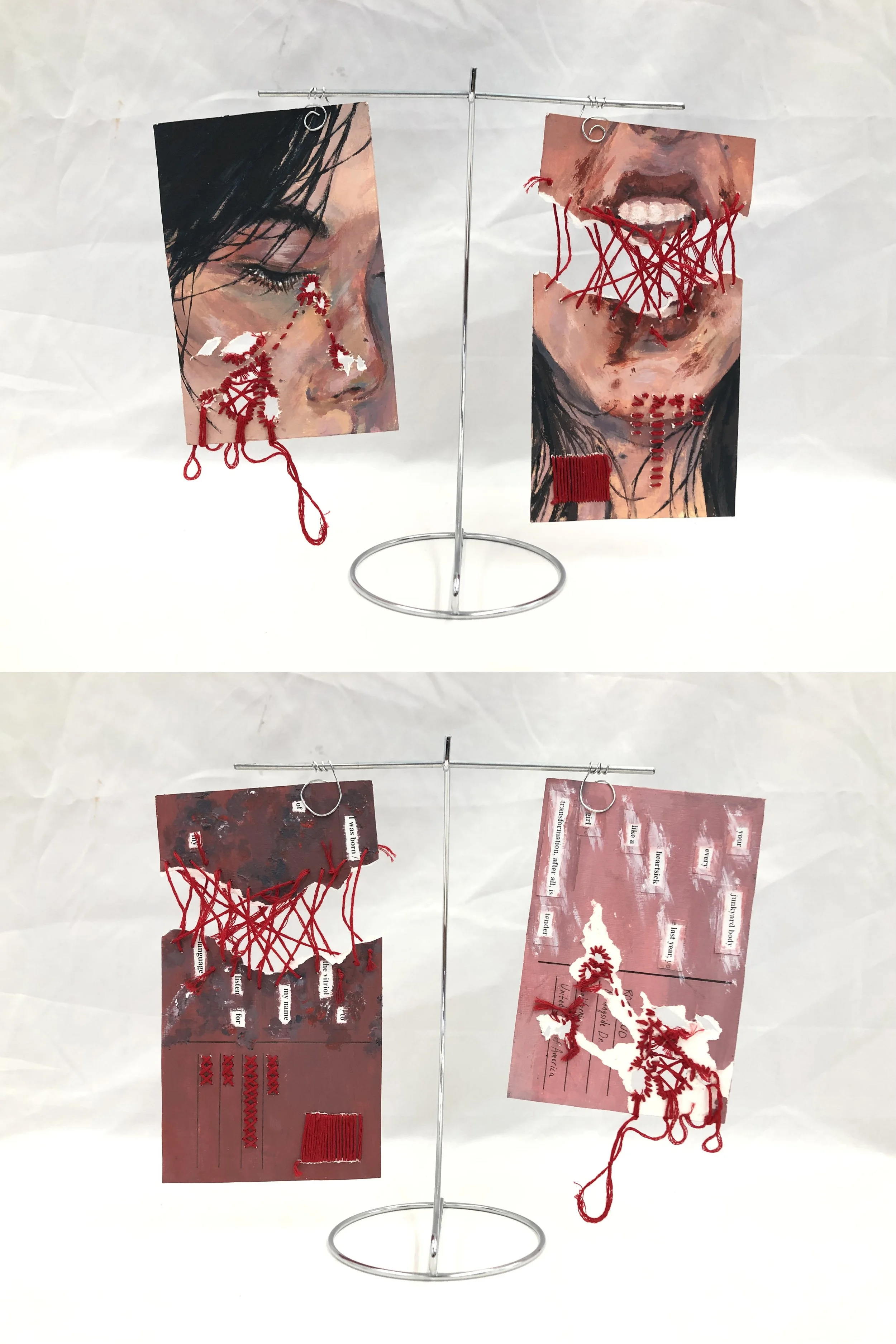 20 cm x 15 cmSelf-Portrait as Postcards reinvents Asian-American poets Eunice Kim’s poem “self-portrait as dialogue” and Fiona Lu’s poem “Turing Test” as 3D postcards. Postcards represent limited forms of communication & connection due to physicality; through a blackout poetry medium, simultaneously fragile and restrictive textile work, and zoomed-in perspectives of my face, I explore how reliance on language-based labels and corporeal bodies create fundamentally limited perspectives on self-identity.