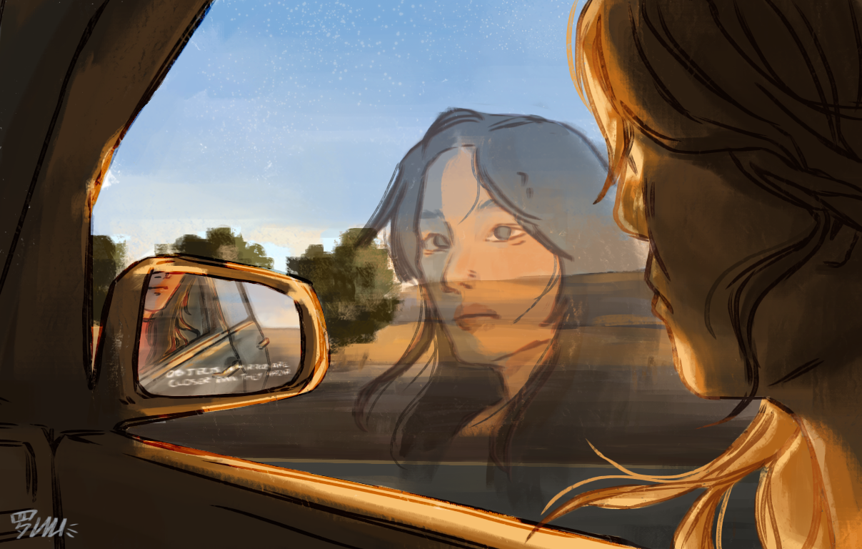 However, as my theme shifted to self-portraiture, my medium largely transferred to digital art. Despite the widely differing styles of Self-Portrait as Artist, Self-Portrait as Car Window, Self-Portrait as Memory, & Self-Portrait as Maps, these works move away from the physical tangibility of previous traditional art into exploring a more abstract conceptualization of self. I begin to focus on subjects that subvert the physical expectations of a self portrait; I indirectly portray myself through my parents, my reflection, & even maps that mimic the lines of a human face. Self Portrait as Decomposition’s elements of vertical composition, nature symbolism, & visible texture through pencil strokes are reminiscent both Self-Portrait as Teenage Bedroom & Self-Portrait as Devotion; through this piece’s bright, polychrome colors & boundary-defining viewpoint, I rework previous interactions of self with cycles of death into more communal, global perspectives.