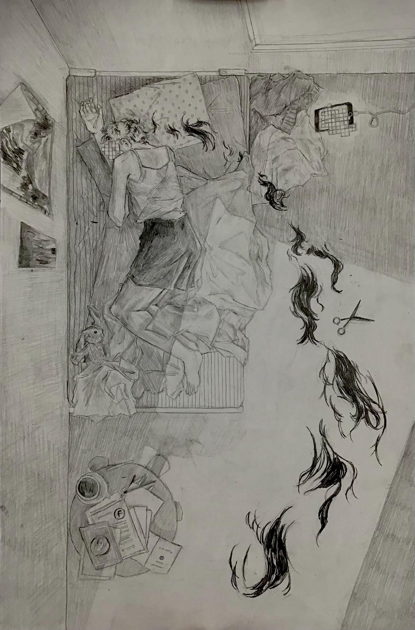 Self-Portrait as Teenage Bedroom’s monochrome style and teenage subject are inspired by Larry Clark’s “Everytime I See You Punk You're Gonna Get the Same”. The dark values and gritty texture of a crowded, darkly lit bedroom based on my own portrays my experiences with mental health & its surrounding stigma. The limited bird’s-eye perspective and contrast of light serve to both ground the viewer in the physical restrictions of the piece and hint at a more hopeful future. -