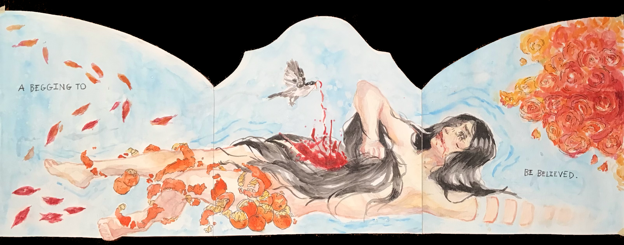 38.2 cm x 13.5 cmSelf-Portrait as Devotion explores my relationship with femininity and the violence often interlinked with it. Inspired both by a quote from the poem Churching by Kristin Chang and Art Nouveau artists, I illustrated this piece as a triptych separated into the myth of Tantalus, Prometheus, and Pelops. These symbols’ religious and mythical connotations further emphasize the societal demands of simultaneous endurance of, devotion to, and beauty in the face of violence from women.