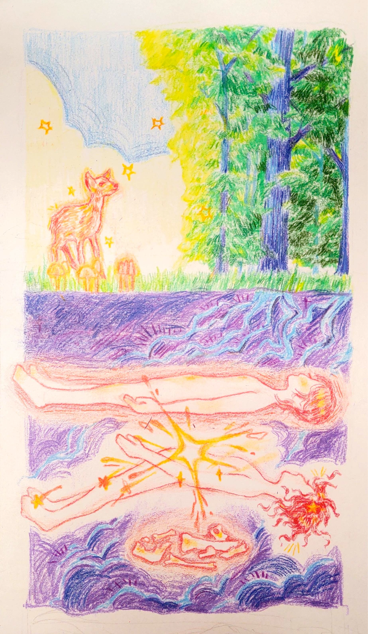 Self-Portrait as Decomposition challenges Western stigma against death through artistic rendition of the cycle between life and death. In vivid bursts of colored pencil, it links together symbols of living deer, a forest, fireflies, the human body, soil, and all earthly processes in itself. Through vivid bursts of colored pencil and a omnipresent perspective, it re-orients my identity & the human experience of life as simply part of a larger, perpetually interconnected world. -