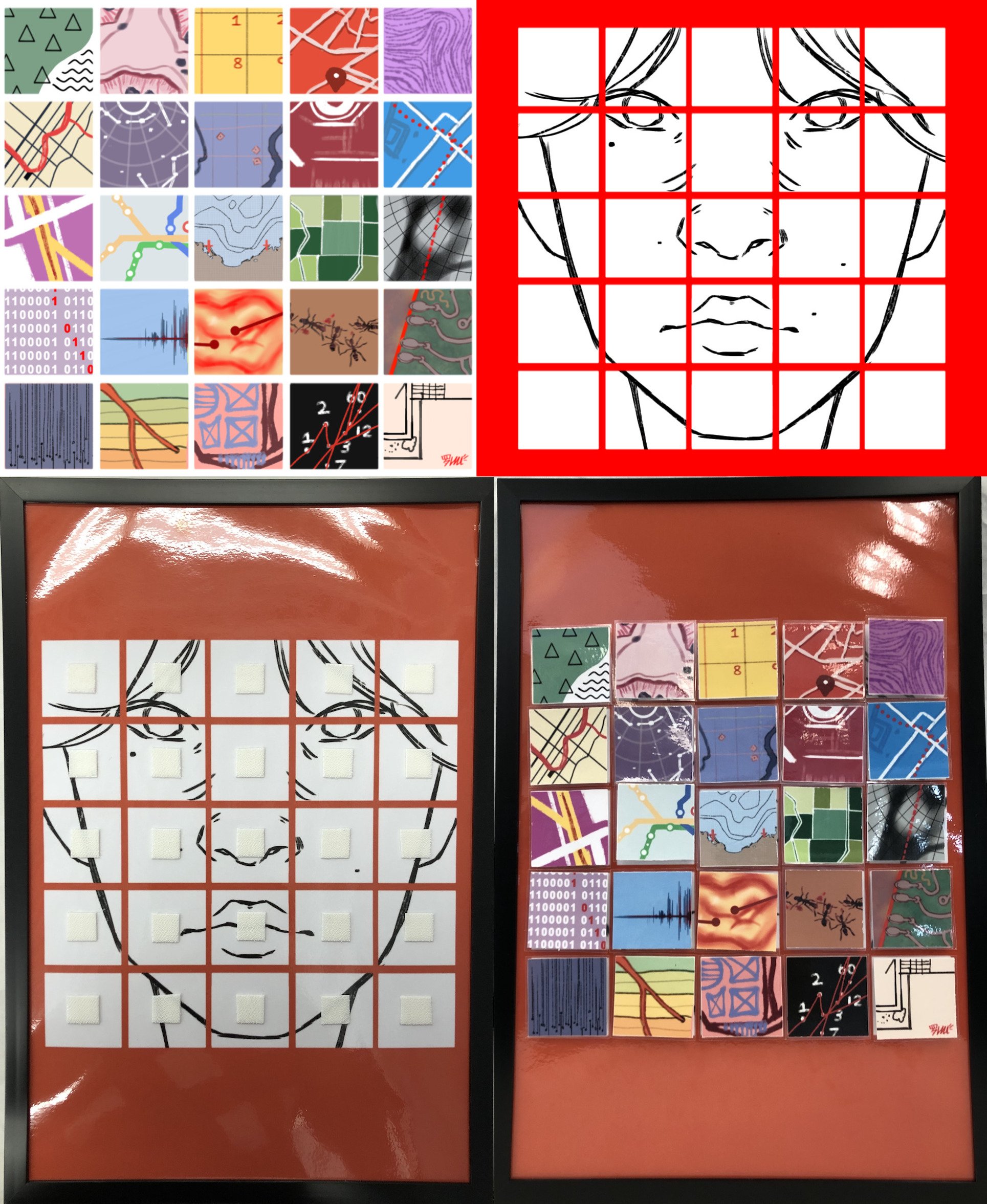 Self-Portrait As Maps subverts traditional self-portraiture, instead presenting a face made entirely of maps to remind viewers of the communal connections behind self. Each image is rendered in diversely different colors, lines, and textures, separated into equal squares. I aimed to emphasize each image not just as physical locations, but the emotional and social connotations behind them— ants as a memory of childhood sweetness and detail, skin cells as a nod towards biology.