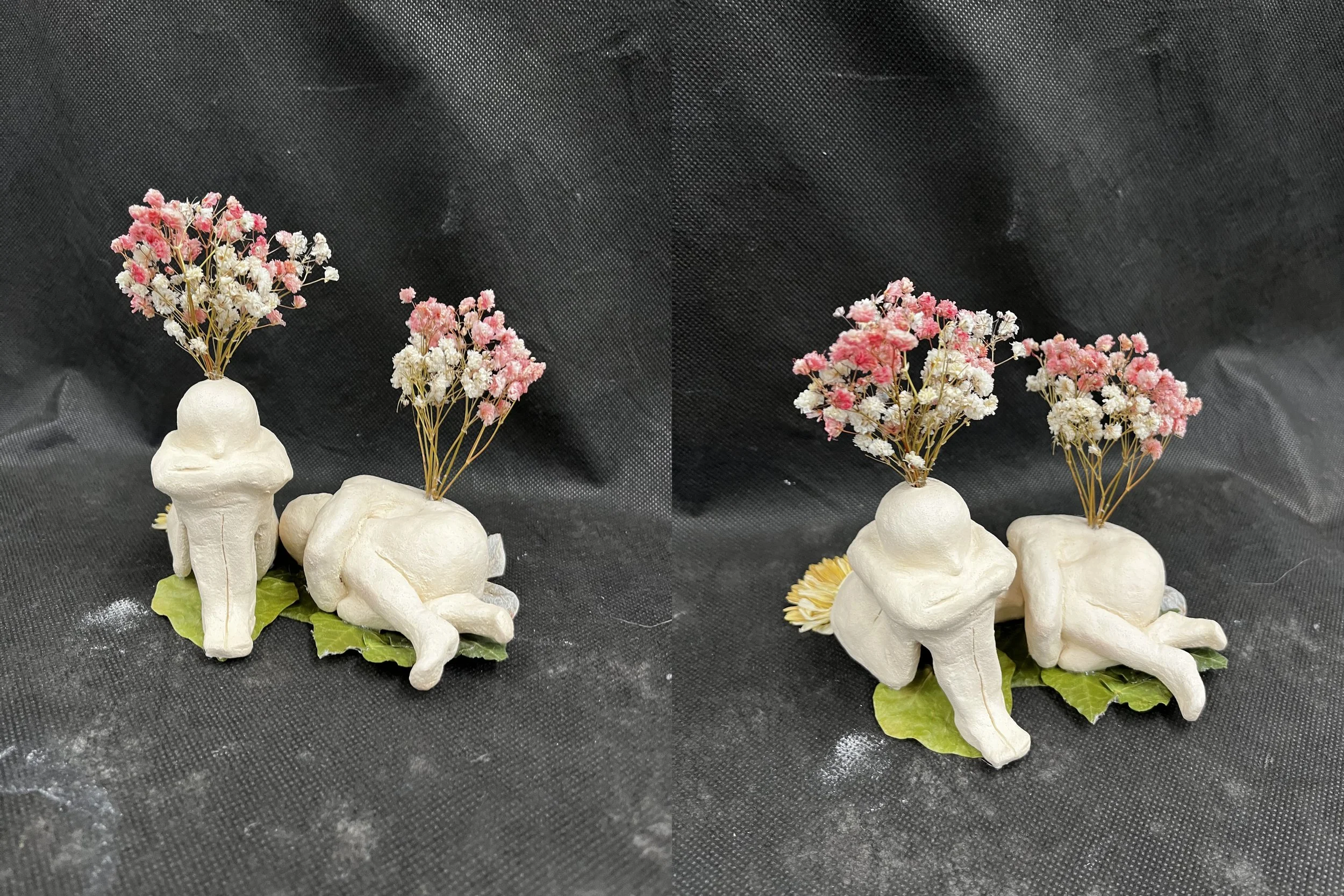 Inspired by an artwork created by SR Studios, and focused on the subject of growth. The fetal position shows innocence and sprouting from it to mature into a new stage of flowering since we are forever growing. The figures have pressed flowers growing out holes in the skull and chest. These two beings go along with the theme of human development and growth being similar to the growth of a flower.
