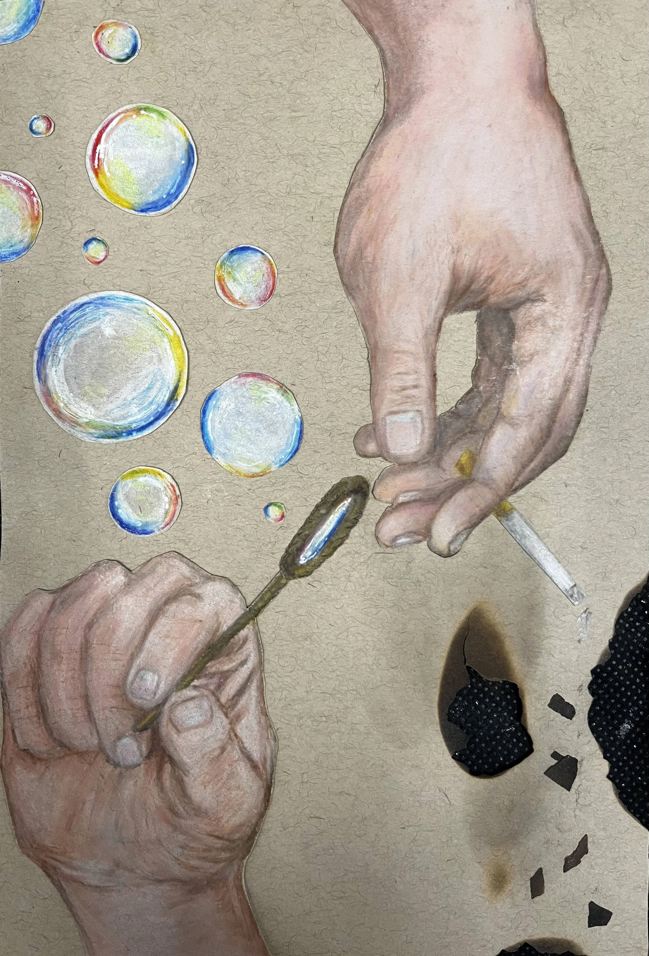 I was inspired by an artwork by Jess Shaw, which showed a baby’s hand versus an older person’s hand. This artwork pushed me to draw hands and connect to human development and growth. When drawing the two hands, I picked two items you'd usually see in the hands of that age group. I connected items to age and growth. Through these items you are shown the change in people and how overtime innocence leaves and you grow up. -