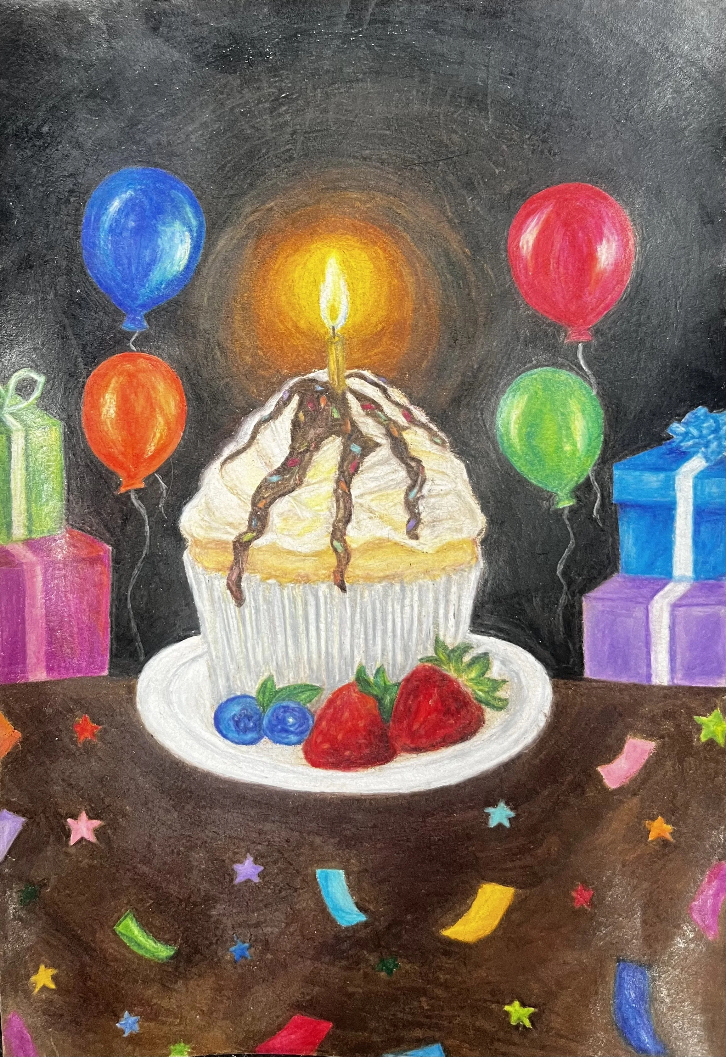 I created this artwork based off of a spark of inspiration from a piece by Joy Argent. I was captivated by the idea of cake. I feel as though cake and celebrations of birthdays mean a lot to the theme of growing up. Not only are you physically getting older but your mind is expanding. With each birthday you become an evolved person. I wanted to implement the message of birthdays being the checkpoint of growth. -