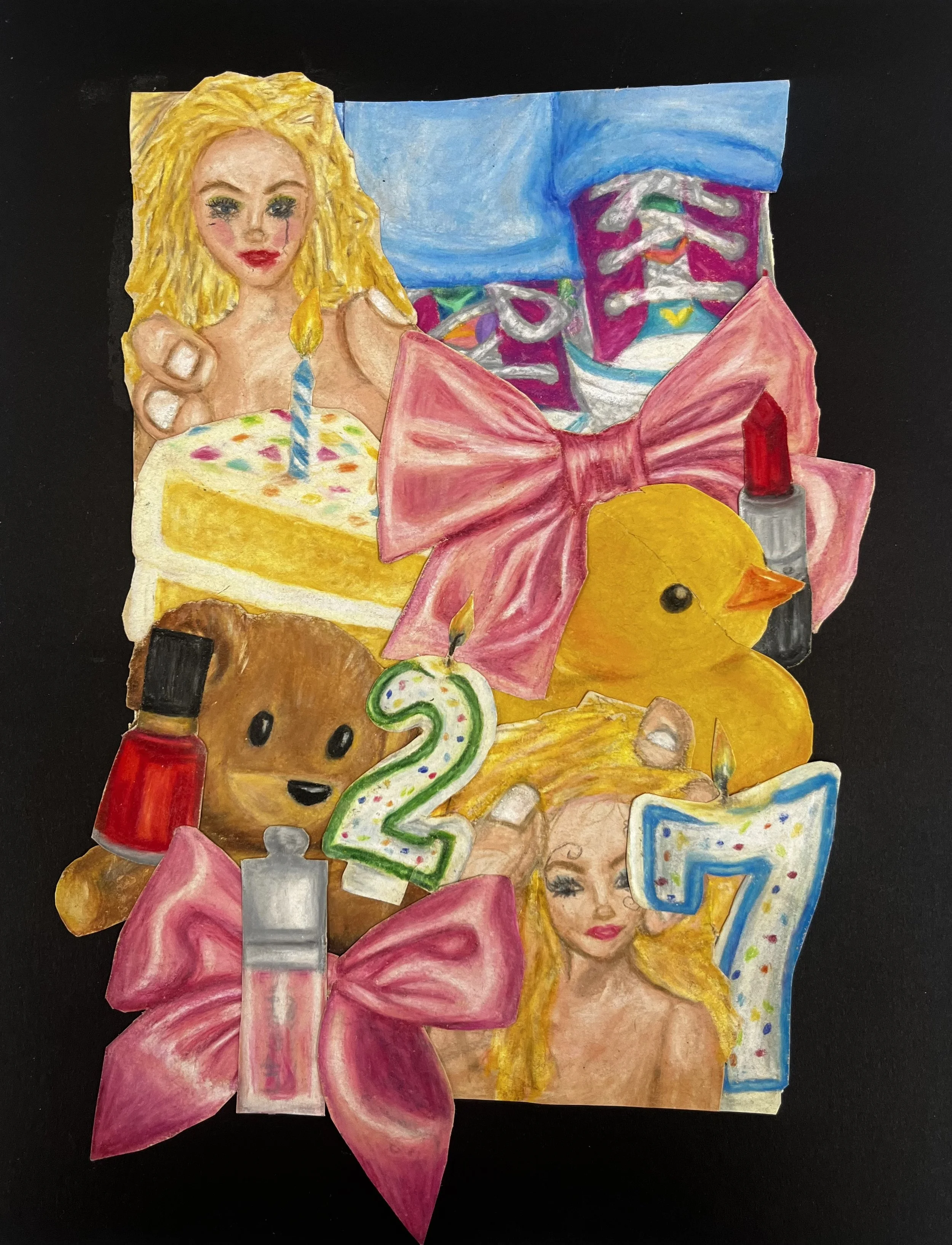 When coming up with ideas I really wanted to create a piece more personal to me. Although others can probably relate, I added things that reminded me of my own childhood and growing up. I used to play with Barbies and had bows everywhere a lot. I wore the same Skechers daily and had those number candles. I felt nostalgic by making a collage of the things that took me back to my childhood and how I have changed throughout the years. -