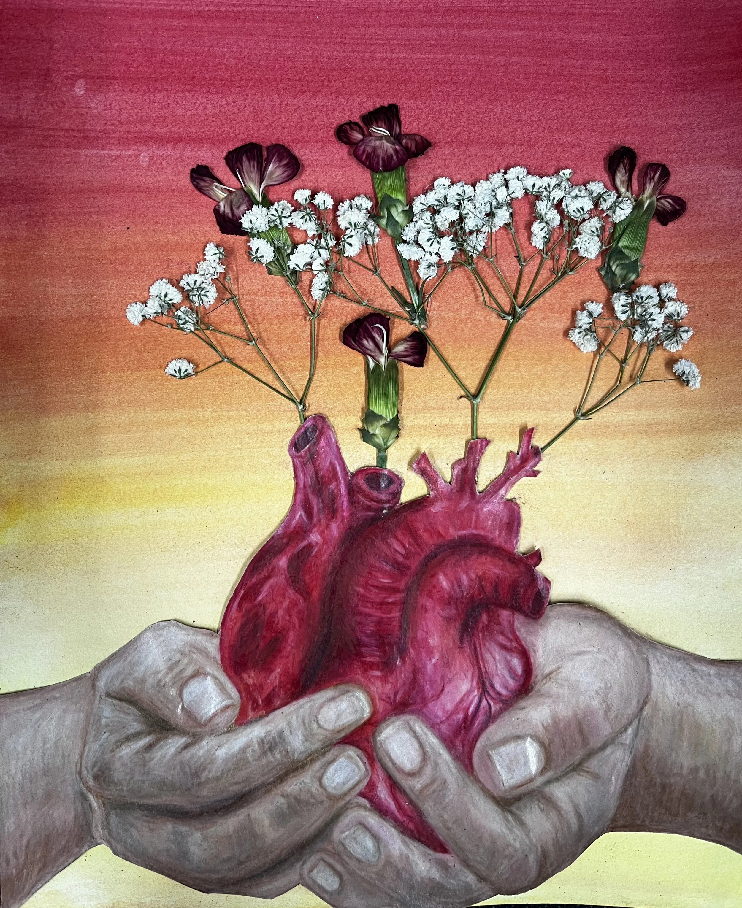 By using pressed flowers positioned to come out of a heart, I represent human development and how as we grow our hearts expand with our thinking. It can show how life is in your hands, you are blooming regardless and your heart will change overtime. -