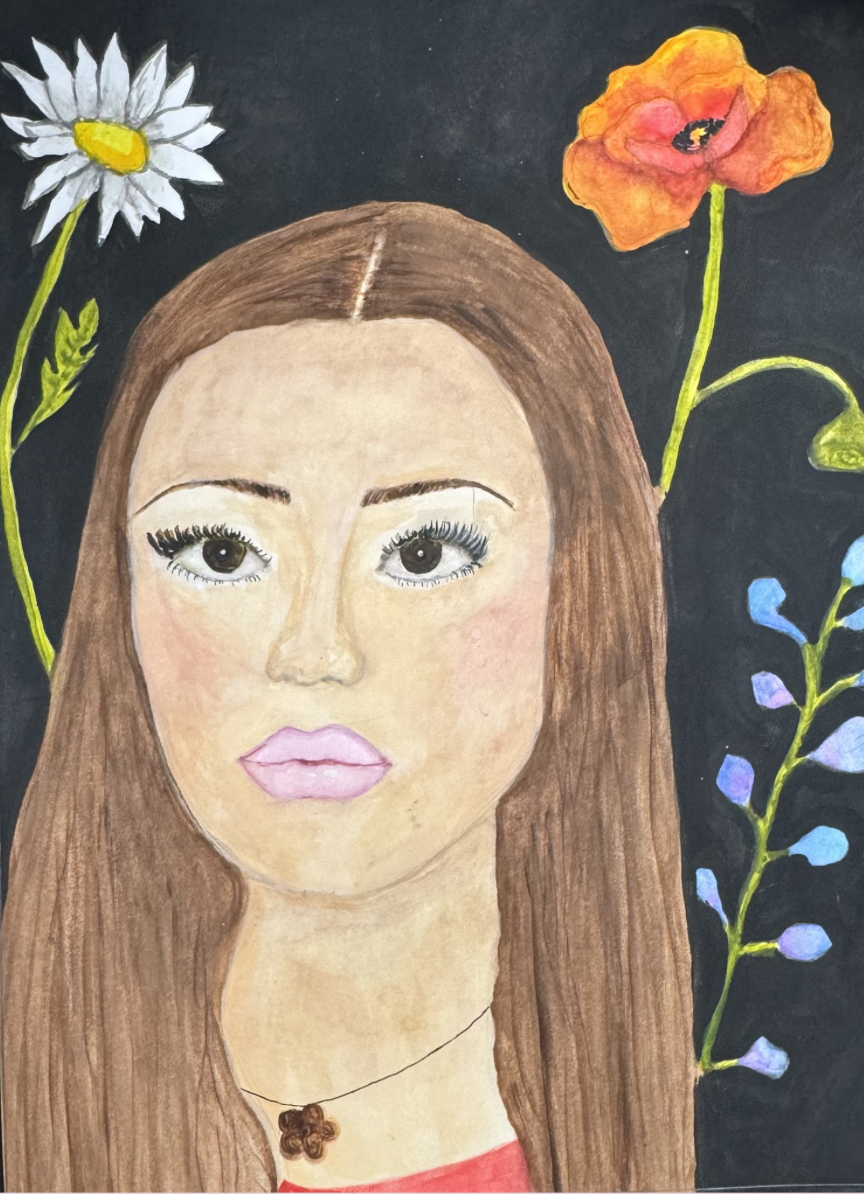 In this piece I explore my personal identity and familial connections through my family member’s birth flowers. Surrounded by the birth flowers: larkspurs and dandelions, each reflects how each of my family members has had an impact on me. The delicate watercolor technique I utilized emphasizes softness, while the vibrant flowers symbolize the uniqueness of each person in my life. This piece reflects how these familial bonds come together to shape who I am.