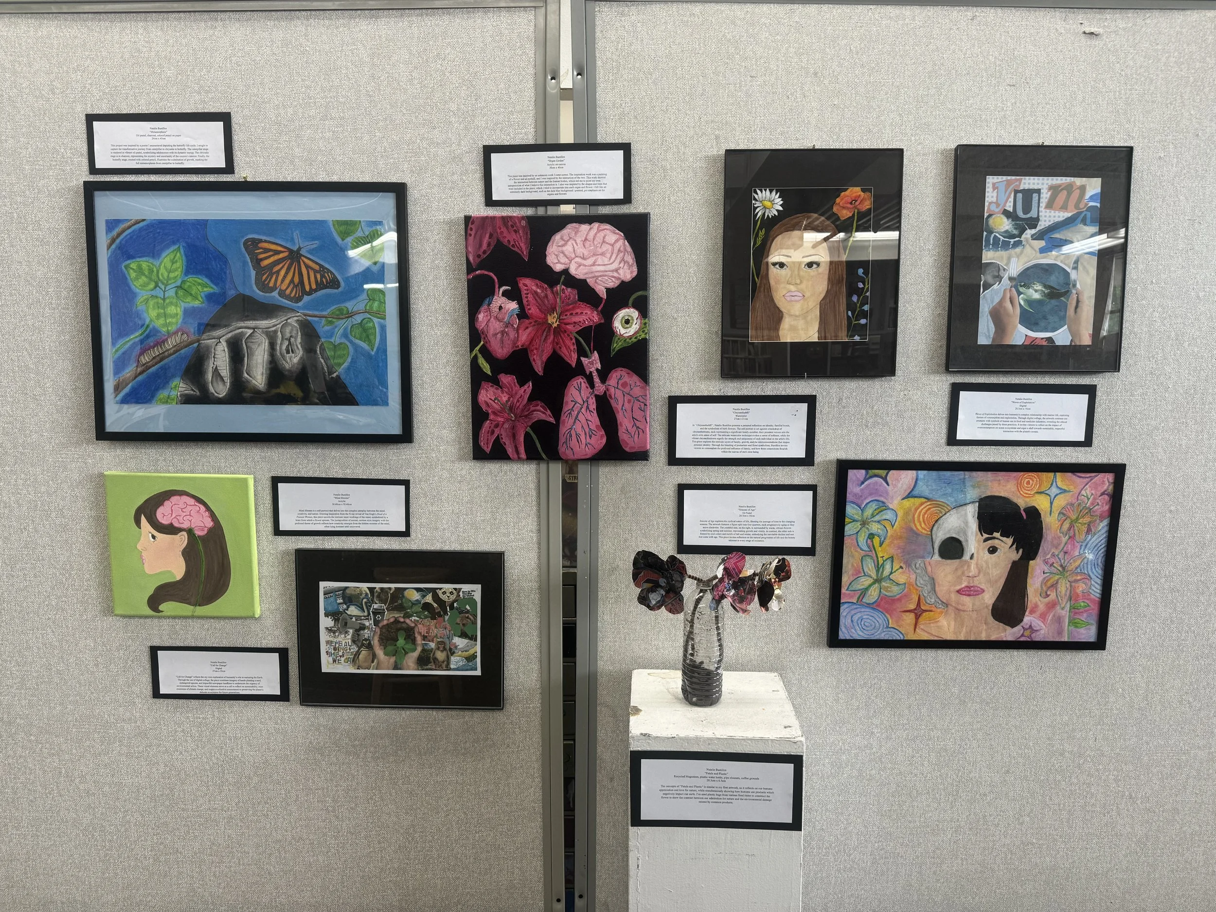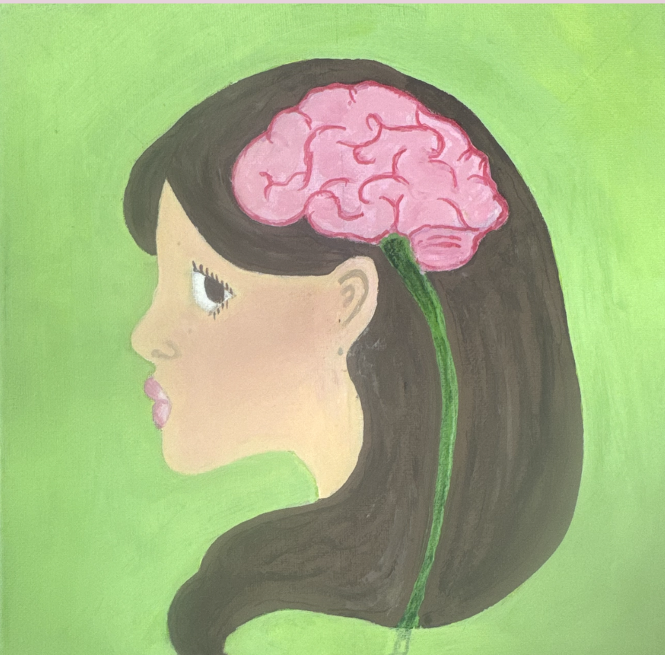 This piece is a self-portrait that explores the interaction between the mind, creativity, and nature. I drew inspiration from the X-ray reveal of Van Gogh’s Head of a Peasant Woman, this piece shows the inner workings of the mind, symbolized by a brain with flowers sprouting. I included a juxtaposition of surreal, cartoon style imagery with the theme of growth reflects how creativity emerges from the hidden recesses of the mind, often lying dormant until uncovered.