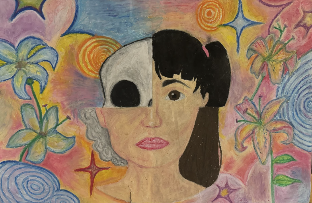 This piece explores the cyclical nature of life, comparing the passage of time to the changing seasons. The artwork features a figure split into four quarters, each progressively aging as they move clockwise. The youthful side, on the right, is surrounded by warm, vibrant flowers symbolizing spring and summer, representing growth and vitality. In contrast, the older side is framed by cool colors and motifs of fall and winter, embodying the inevitable decline and rest that come with age.