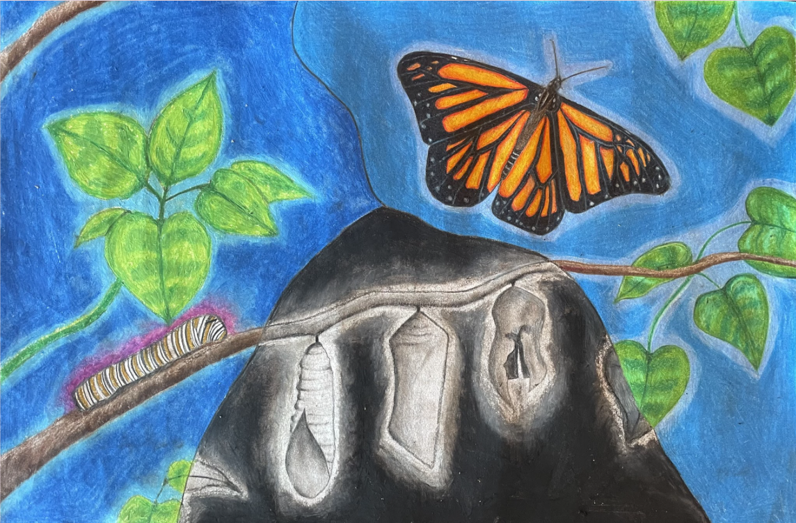 This piece was inspired by a poster depicting the butterfly life cycle. I sought to capture the transformative journey from caterpillar to butterfly. The caterpillar stage is created with vibrant oil pastel, symbolizing adolescence. The chrysalis stage is in charcoal, representing the mystery and uncertainty of the cocoon’s interior. Finally, the butterfly stage, created with colored pencil, illustrates the culmination of growth, marking the full metamorphosis from caterpillar to butterfly.
