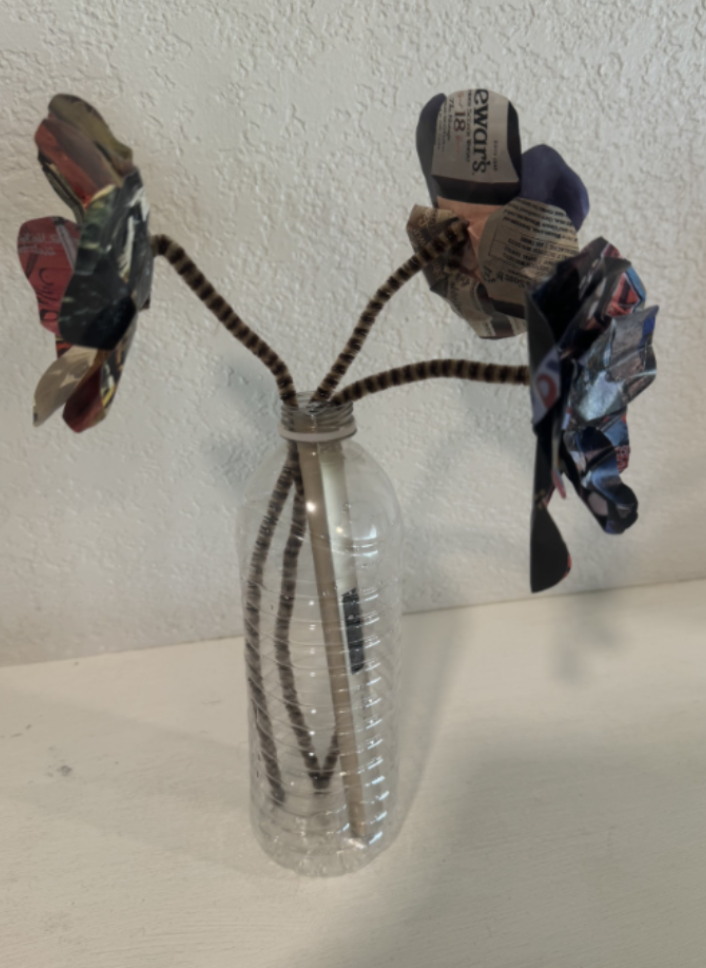 Recycled Magazines, plastic water bottle, pipe cleaners, coffee grounds