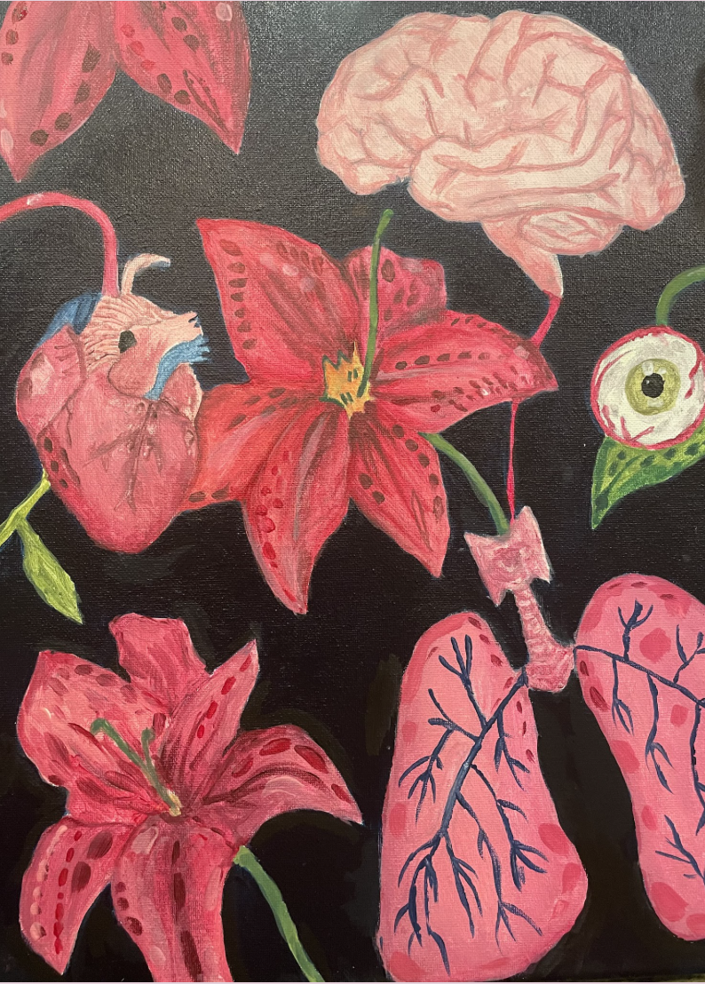 This piece was inspired by a work I came across online. This work is meant to demonstrate the interaction between nature and the human bodies, which led me to paint my own interpretation of what I believe this interaction is. I was inspired by the shapes and lines that were included in the piece, which I tried to incorporate into each organ and flower in my piece. I felt like an extremely dark background, such as the dark blue background I painted, also put emphasis on the organs and flowers.