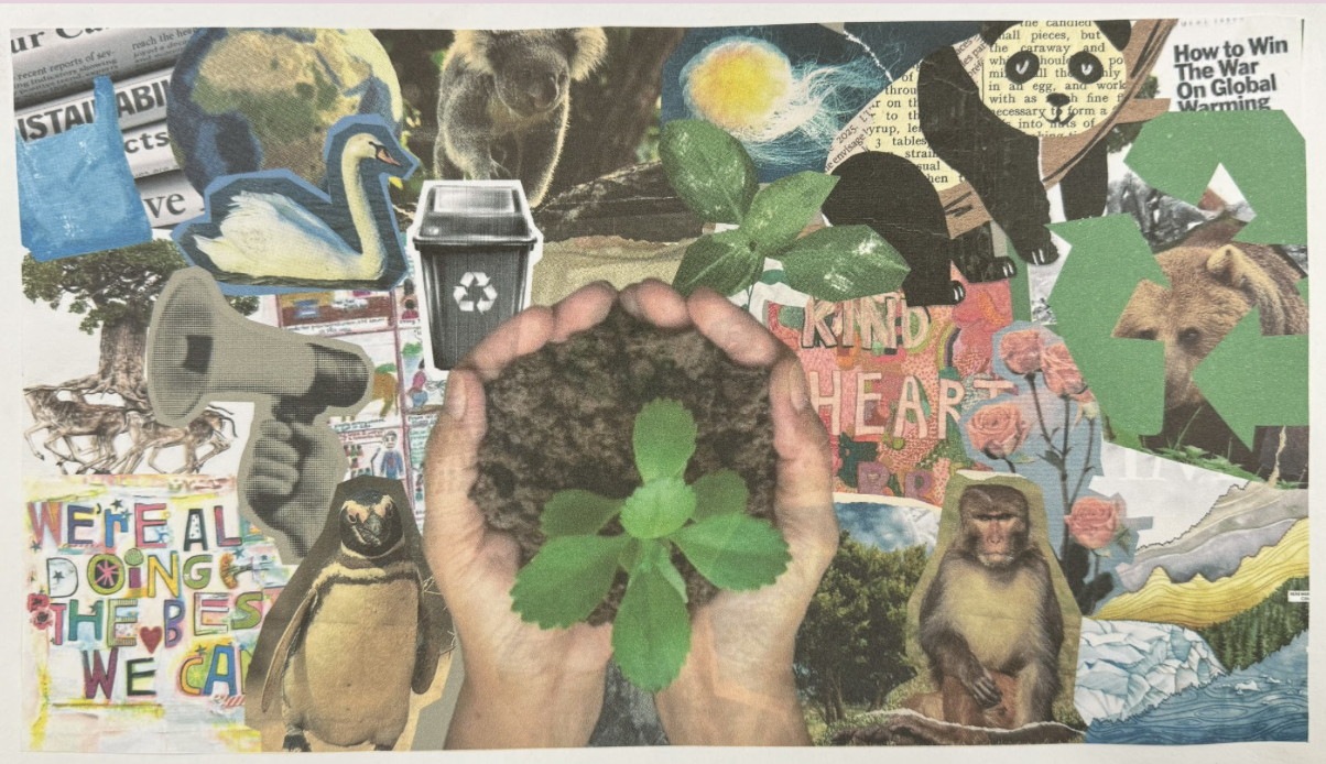 This piece reflects my personal exploration of humanity’s role in nurturing the Earth. Through the use of digital collage, the piece combines imagery of hands planting a seed, endangered species, and impactful newspaper headlines to underscore the urgency of environmental action. These visuals serve as a “call” to reflect on sustainability, raise awareness of climate change, and inspire a collective commitment to preserving the planet’s delicate ecosystems.
