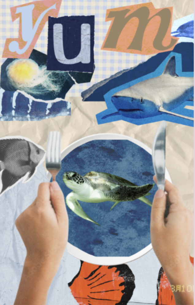 This piece dives into humanity's relationship with marine life, exploring themes of consumption and exploitation. Through digital collage, the artwork contrasts sea creatures with symbols of human use in food and medicine industries, revealing the ethical challenges posed by these practices. It invites viewers to reflect on the impact of over consumption on ocean ecosystems and urges a shift towards sustainable, respectful interaction with the planet's oceans.