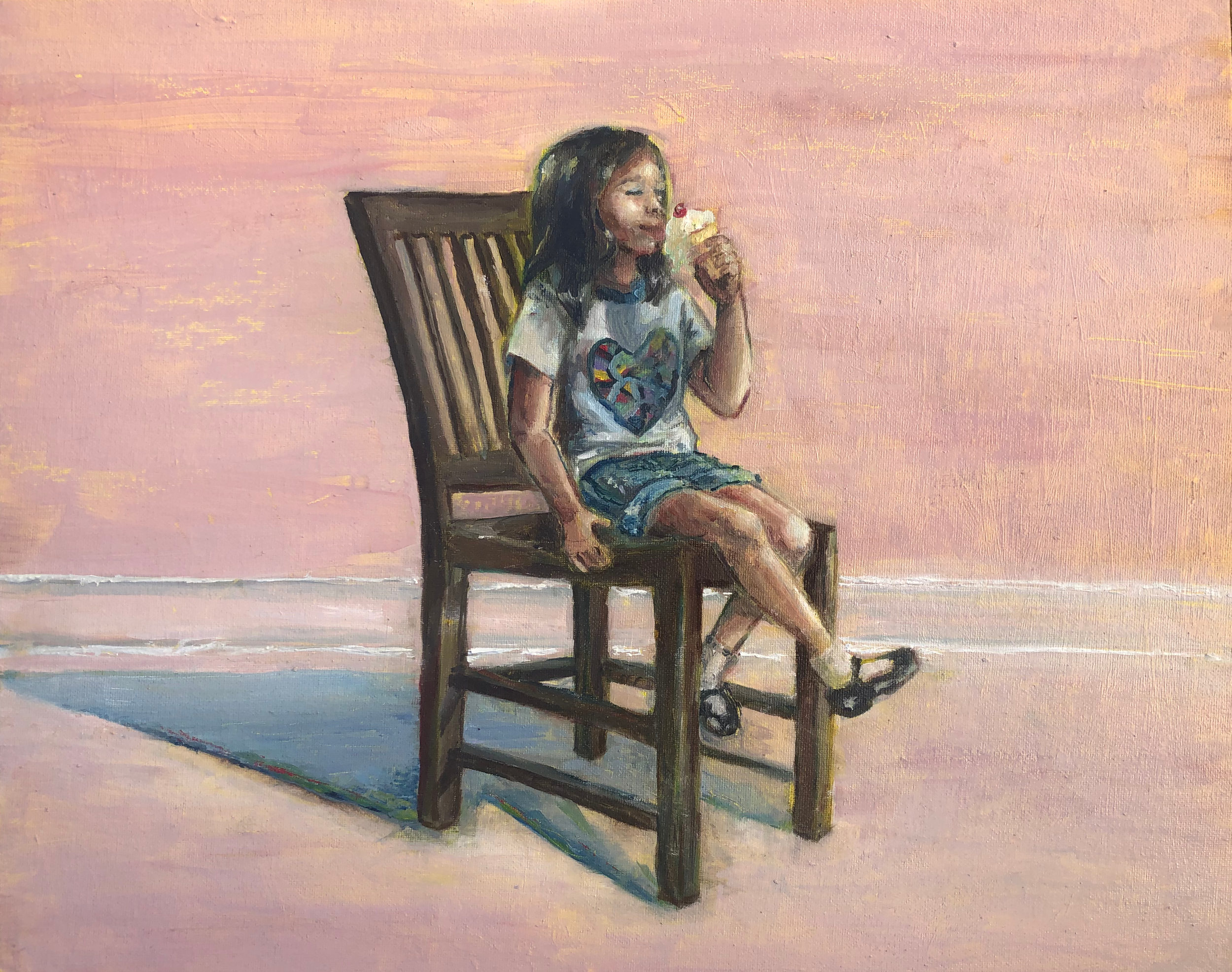 This art piece reflects how I would visualize the woman in the original painting as a young girl- hence the title, Back in Time. I took the pattern of the skirt from my inspirational artist, Wayne Thiebaud’s ‘Tapestry Skirt’, and incorporated it into the shirt of the child in my own painting. I included the ice cream cone that the little girl is devouring, which both accentuates the childish nature of this young girl as well as it being an ode to Thiebaud — a painter known for creating artworks consisting of mouth-watering desserts.