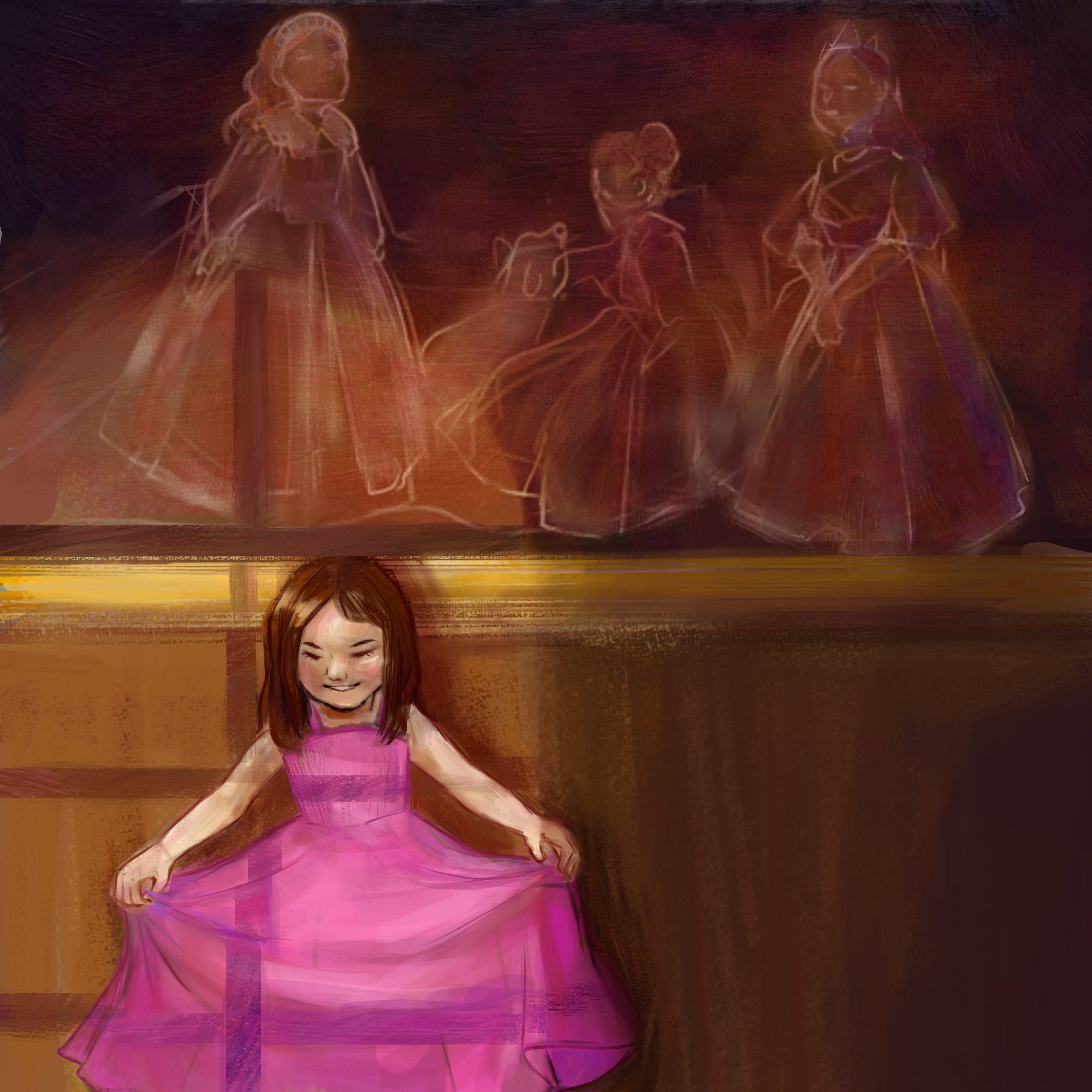 This piece was inspired by a painting of three Russian princesses I saw at a hotel lobby. This digital painting illustrates a story of an imaginative, young girl who pretends she is one of them and is of royal descent, hence the title, ‘Long Lost Princess.’ I incorporated the warm light coming through the window in order to place emphasis on the girl, as the main subject of this piece.