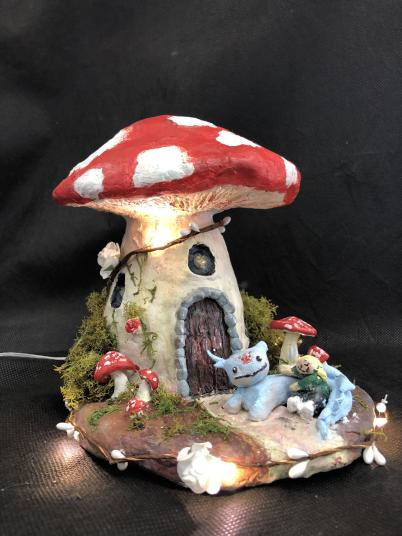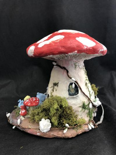 Air-dry clay, aluminum foil, moss, hot glue, fairy lights, acrylic paint, mod-podge