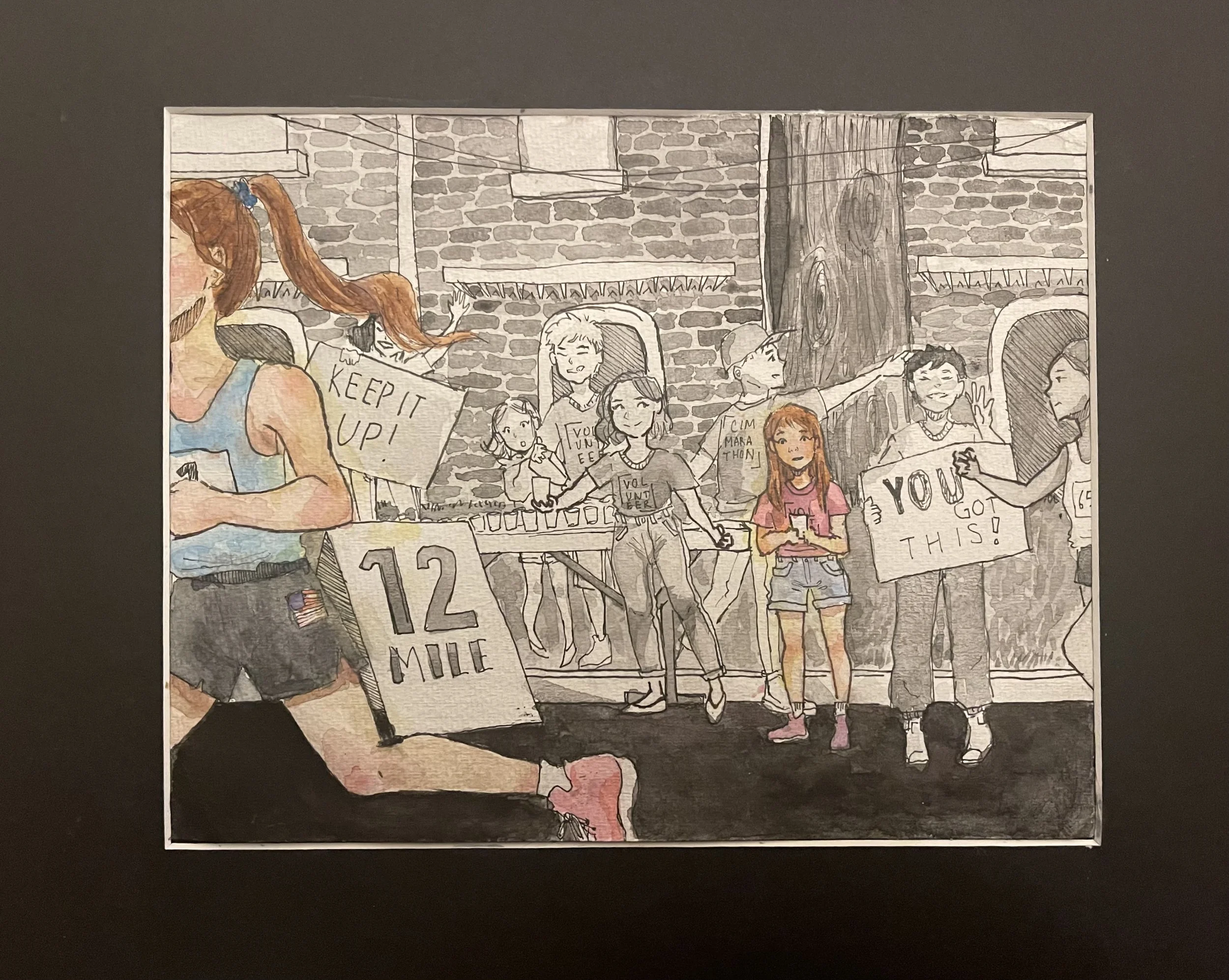 This piece was inspired by a friend on the cross country team and her determination in the sport. This led me to create a piece that captured her as a young child aspiring to be what she is today- an exceptional runner. I incorporated brighter colors in order to place emphasis on the child and the runner, which contrasted with the black and white of the rest of the piece. This artwork allowed me to express a child's curiosity and imagination that can turn into reality.