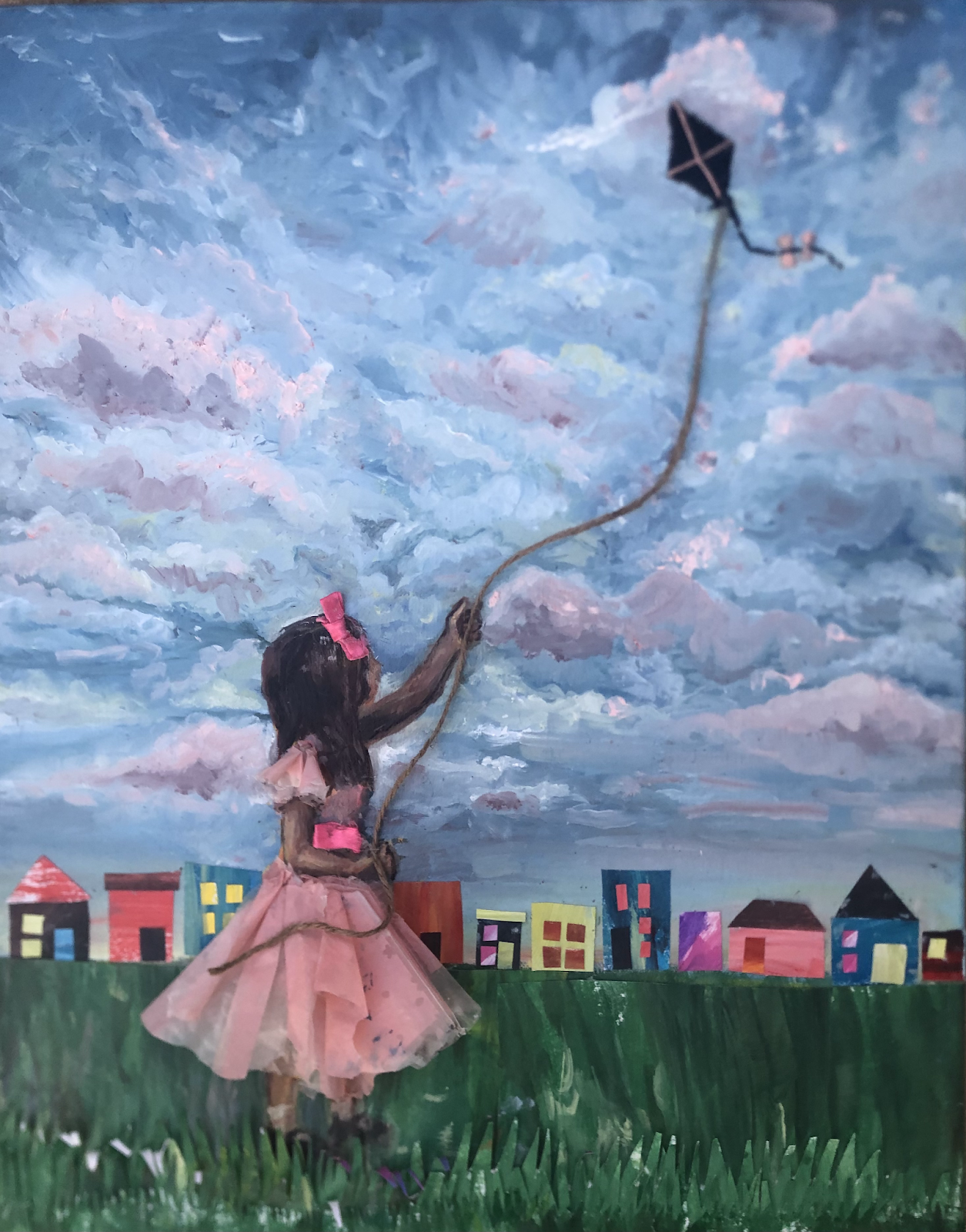Holding On depicts a young girl holding tightly onto a kite. The warm-toned color palette in this piece expresses the warmth of the happiness that one experiences as a child- free from all of the worries in the world. I incorporated mixed media techniques including an Eric Carle-inspired style collage along with embroidery stitching and found objects. This implementation of abnormal shapes, textures, and colors express the creative and imaginative young minds of children.