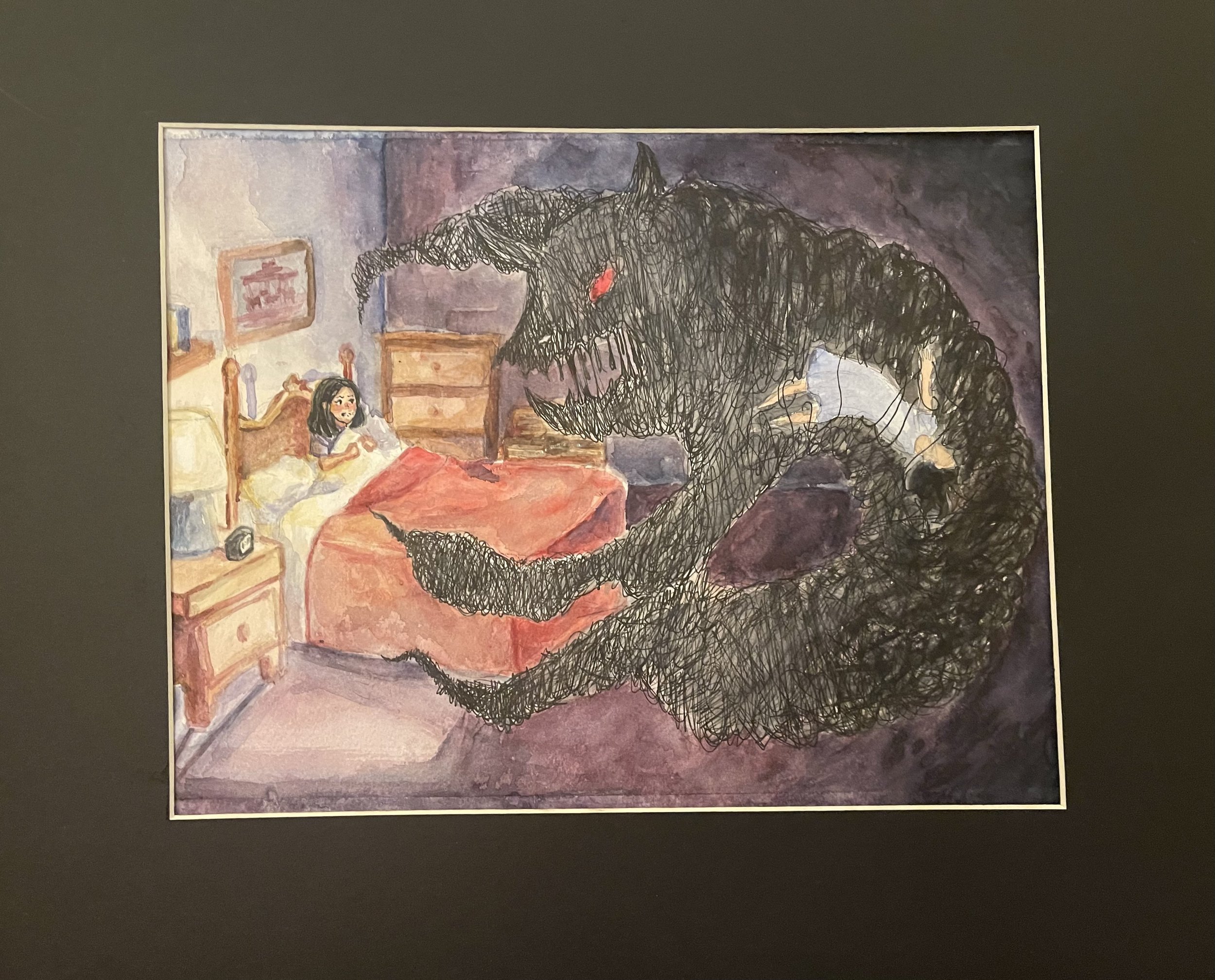 This piece was inspired by Heikala, a watercolor artist based in Finland. My intention for this piece was to portray childhood fears, specifically the legend of the bogeyman hiding under the bed and scaring children in their sleep. The scribbled effect drawn on the monster highlights her imagination, which symbolizes her own creation of the monster.