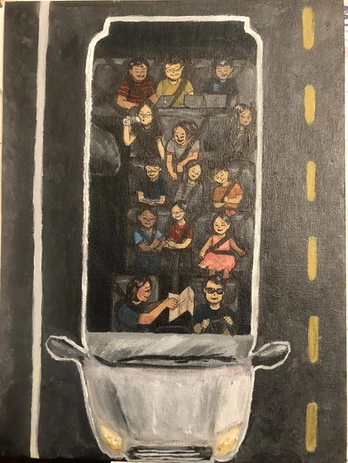 Inspired by Pascal Campion’s, ‘Family Meal,’ this piece, 'Road Trip’ captures the essence of familial love and compassion. This painting depicts the moments of togetherness of a family. As a personal touch, I incorporated my perspective and experiences as a child in a 14-person family on a road trip.