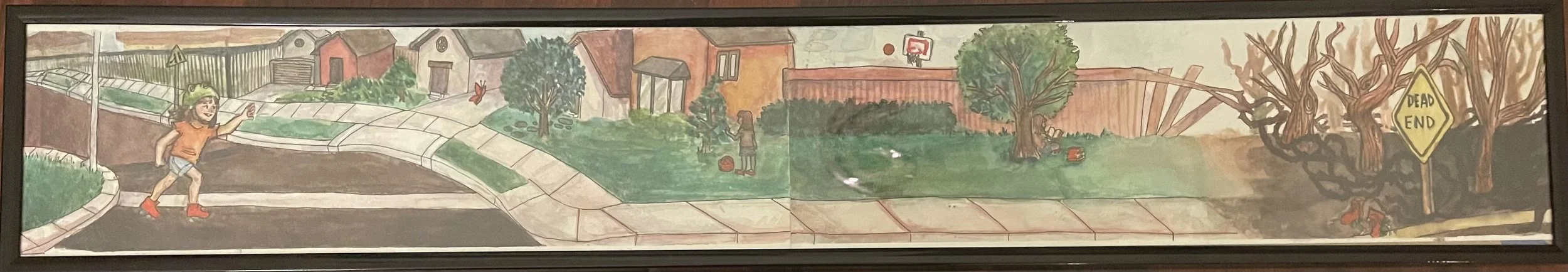Dead End depicts a young girl chasing a butterfly while roller skating in her neighborhood. The orange color in her skates, the butterfly, a basketball in the background, and a book symbolize the small, seemingly-mundane things in life that many children experience. The skates sitting below the “Dead End” sign represent the end of one’s adolescence, symbolizing how we do not realize how important these experiences make up our childhood until it is over.