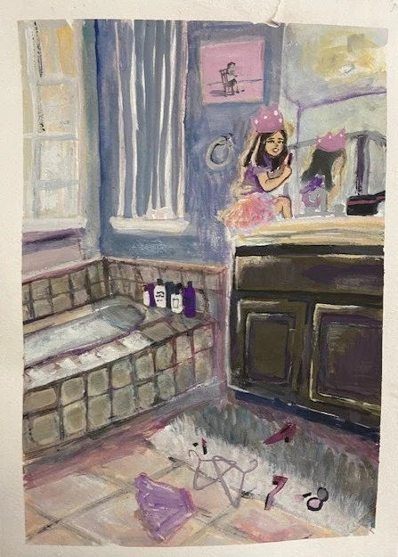 This piece is inspired by Aliya Chen, an artist who finds a way to highlight complex perspectives within her compositions. In this piece, I focused on perspective in order to depict a story of a young girl, inspired by a real-life event that occurred in my life. This setting characterizes the girl as a mischievous and curious child, telling the story of how she would go to great lengths to create her own world through playing pretend- even if it means sneaking in a swipe of her mom’s lipstick.