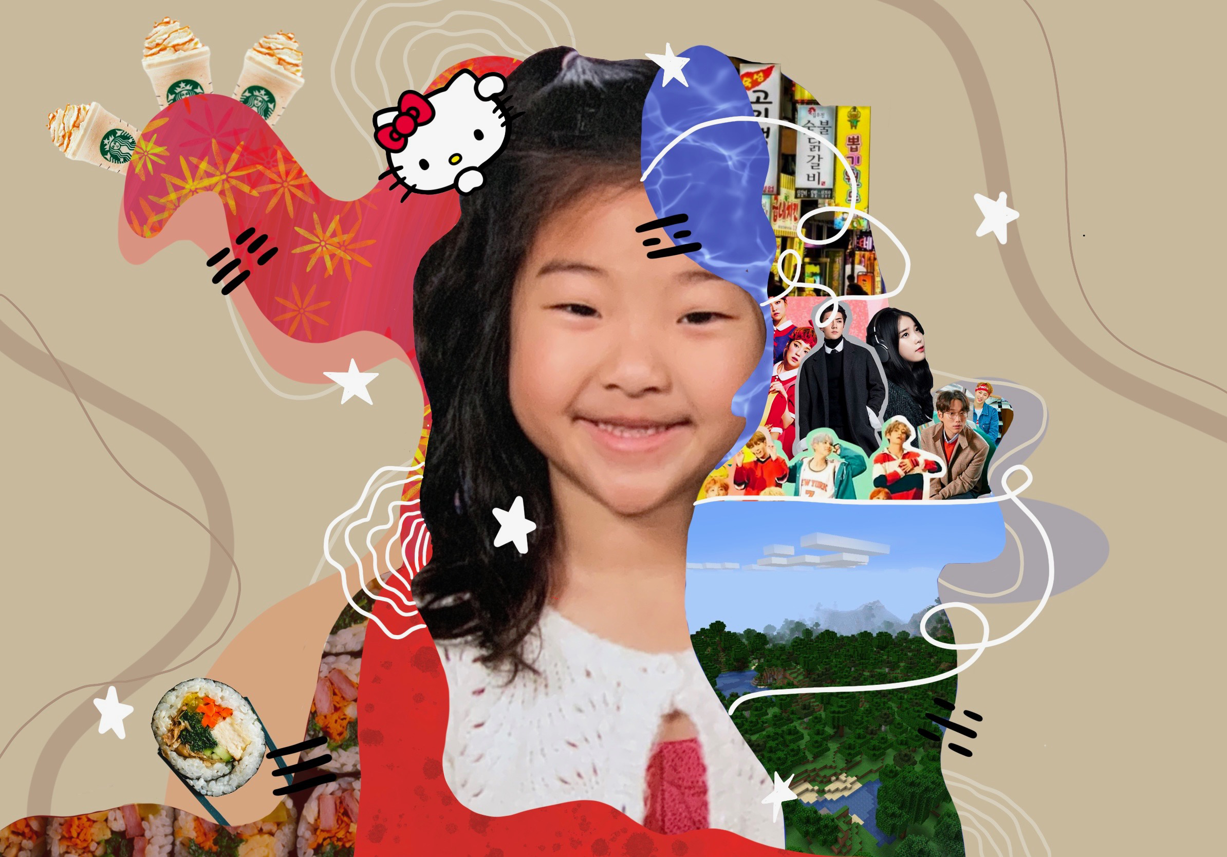 This piece was inspired by Ankur Patar’s digital artwork. The blobs, lines, and vibrant colors were the main points of inspiration to create this artwork. My intentions were to have an image of myself being surrounded by different blobs that incorporated different parts of my childhood. I also used colors and small icons (stars and lines) to my advantage to connect to my American and Korean culture. I used different elements to make this piece busy and detailed, yet “simple” overall.