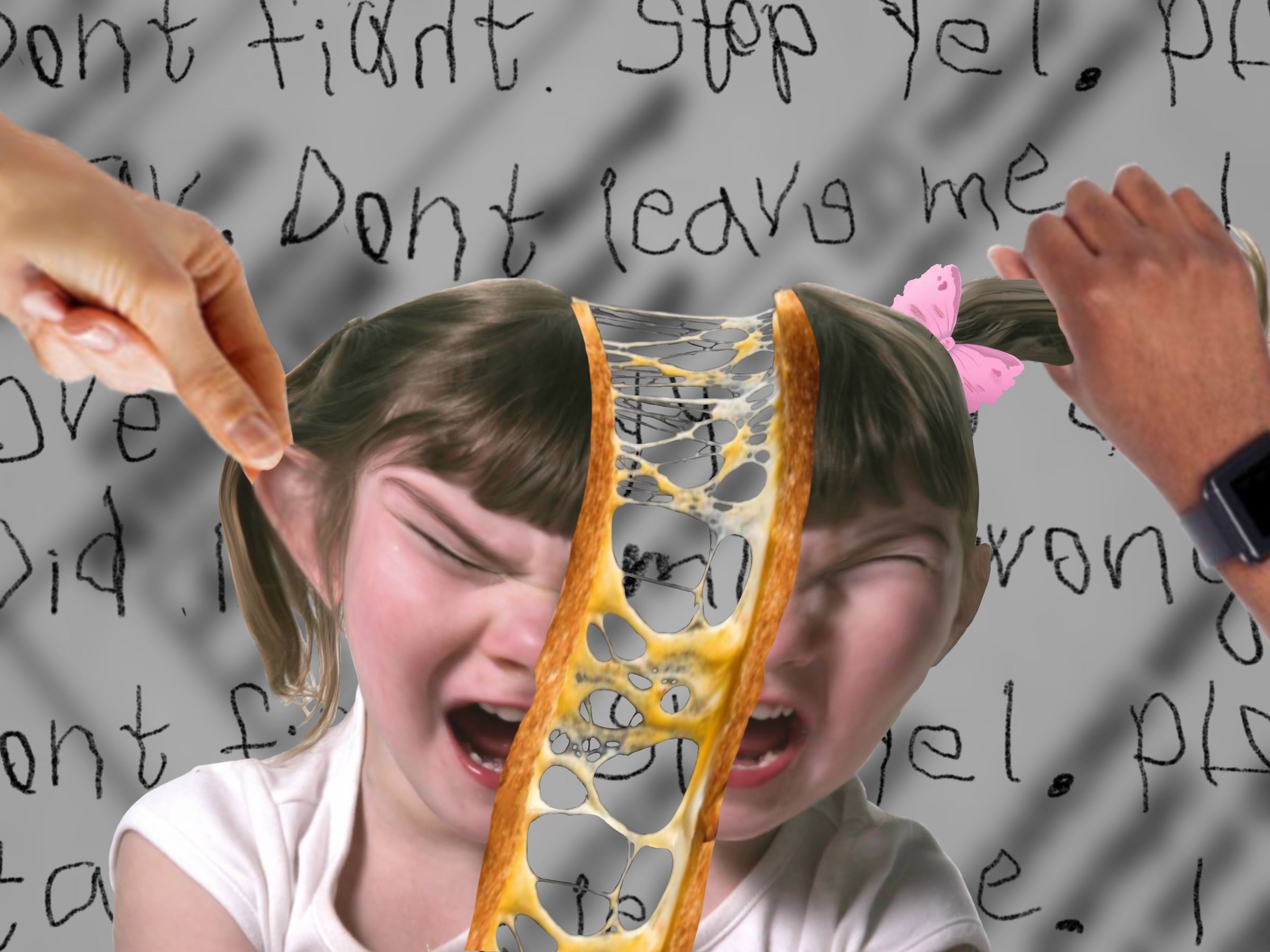 This piece was inspired by Johnson Tsang and the way he molds and squishes his clay sculptures. I used this method to create a digital art piece that is used to show the effects of a divorce on a child’s mental health. The piece shows a little girl who is being stretched apart by her parents due to a divorce. Her mental health is being torn apart because the little girl is blaming herself for this happening, which can be seen in the text in the background.