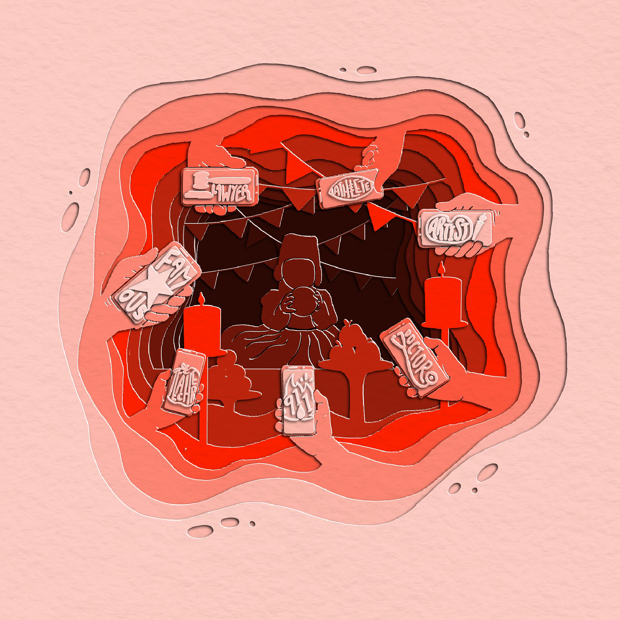 In this piece, different shades of red were used to create layers. These layers reveal a child in the middle who is having their traditional Korean birthday for children that turn one year old. As the layers are added, more about the piece is revealed. My intentions for the piece were to show the pressures of societal standards on one’s childhood. The phones with the different careers on top symbolizes people wanting to know the career paths of a baby as soon as they are born.
