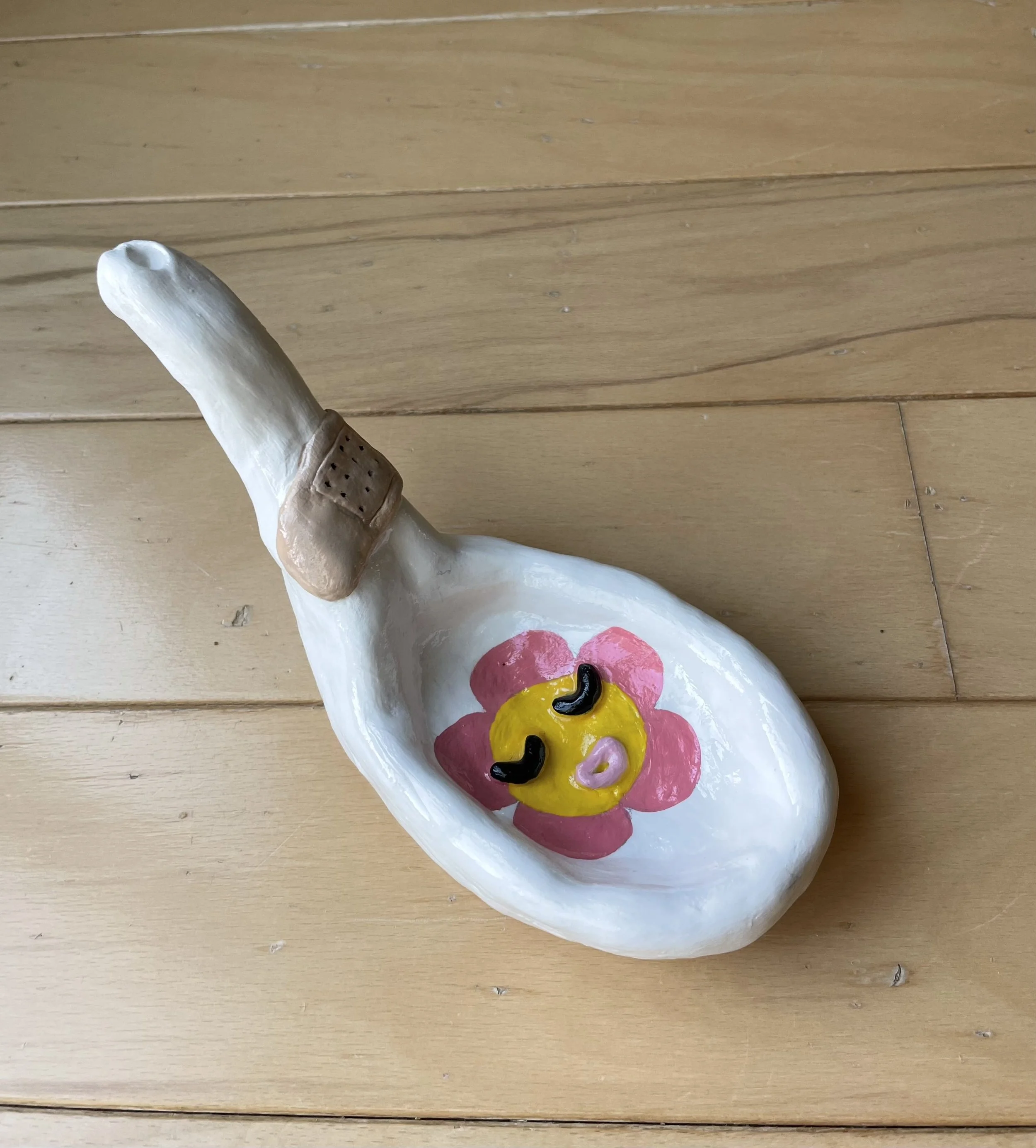 Inspired by the bright and colorful aesthetic that Kjellberg has incorporated into her clay artworks, these qualities were given to the same intentions of The Universal Spoon. The flawed but positive and shiny artwork gains insight into the damaged but healed, beautiful relationship I have with my father. The spoon represents our relationship while it itself has contributed greater bonds and healing towards the father-daughter’s relationship through its functional use.
