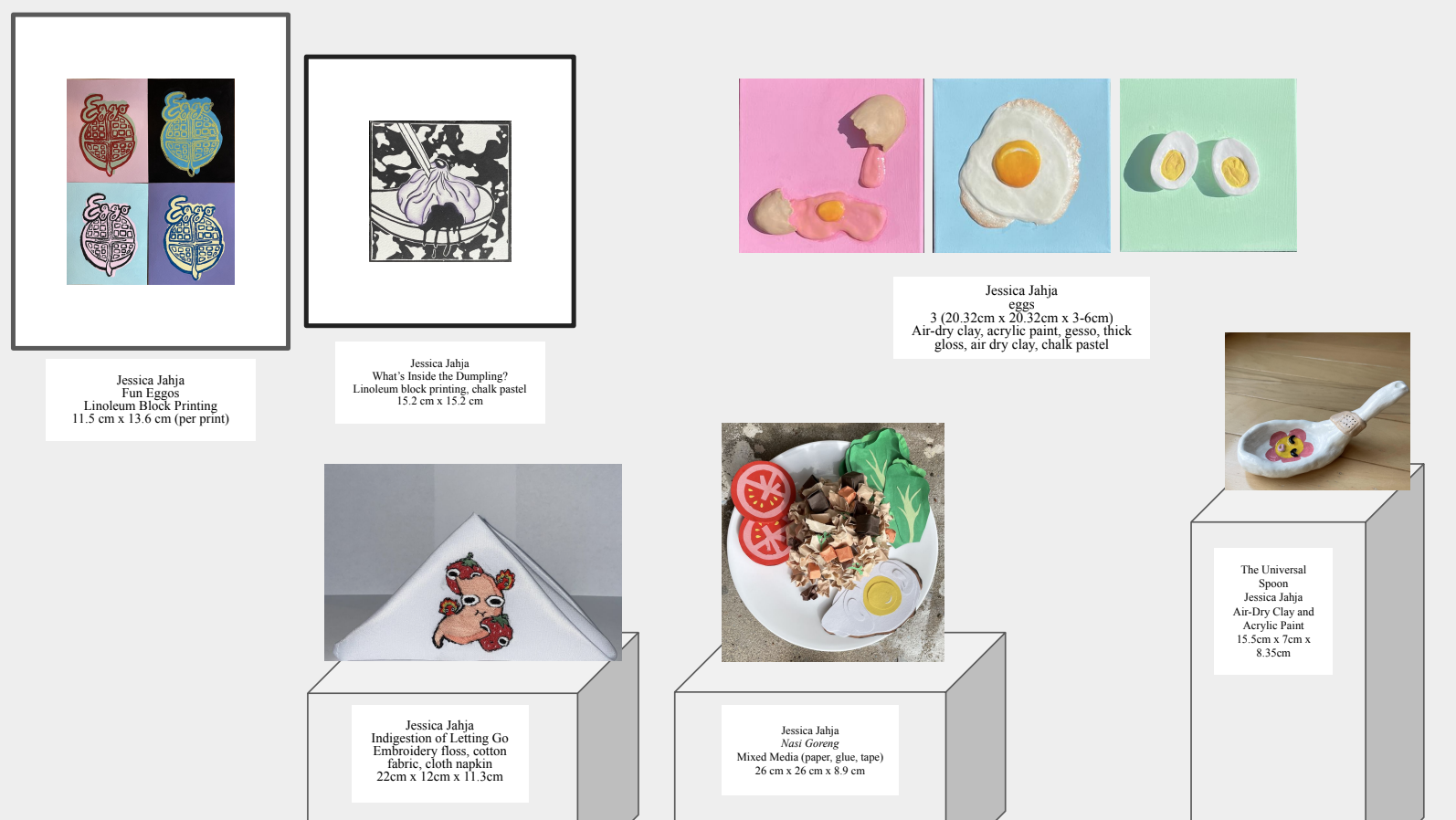 The intention is for viewers to appreciate food on a deeper level as they reflect on their past life, and appreciate the unique and beautiful experiences created from the involvement of food. It is to discover the complexities of food in that each one is incredibly unique but can be inclusive for all to try out and learn from. The arrangement of my exhibition is to be able to show how I improved in different artistic technical skills but dabble in other mediums that are of my expertise and as well as outside of my comfort zone. It reveals the commitment to mediums that are of my interest but to have the courage to explore other new ones and embrace the mediums that have rooted my passion for art. For example, my exhibition has two sides each including its own medium. One side shows two artworks of the same medium of printmaking and compares the improvement in techniques between them. The same goes for the other side but of the medium of air-dry clay. The center area presents two artworks, one of my comfort and exploration in embroidery while I jump into the unfamiliar world of origami in the other piece. This is to create a balance of appreciating the past, present and future of my memories with food and art. Just as how food has become intertwined into the memories that make me who I am, viewers can draw inspiration from their own experiences of food that have highlighted who they are as well along the journey of viewing.