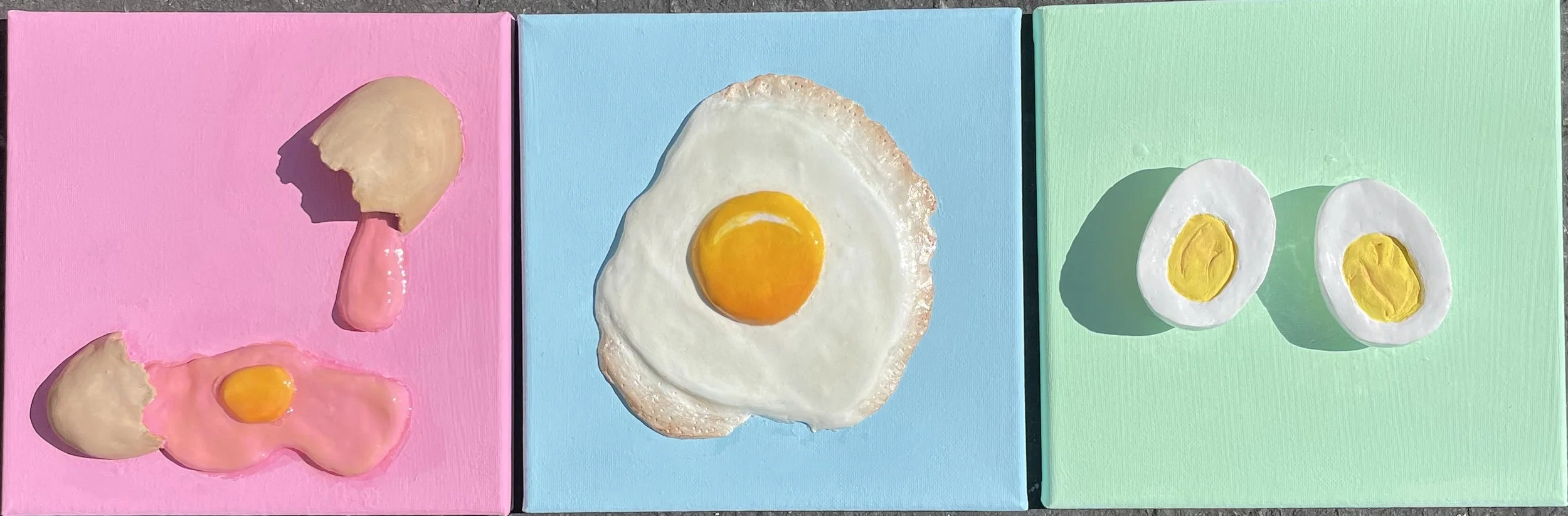 Using Burke’s realism of clay as inspiration, I aimed to capture the versatility of eggs in three different forms. These are the forms I so distinctly remember and relied on in eating while growing up. Incorporating unique compositions and color palettes ensure each piece to highlight its own identity while maintaining a unity of simplicity and of the same ingredient. The bright background and shiny coat becomes a remembrance of a gentle past that is parked from the appreciation of the egg.